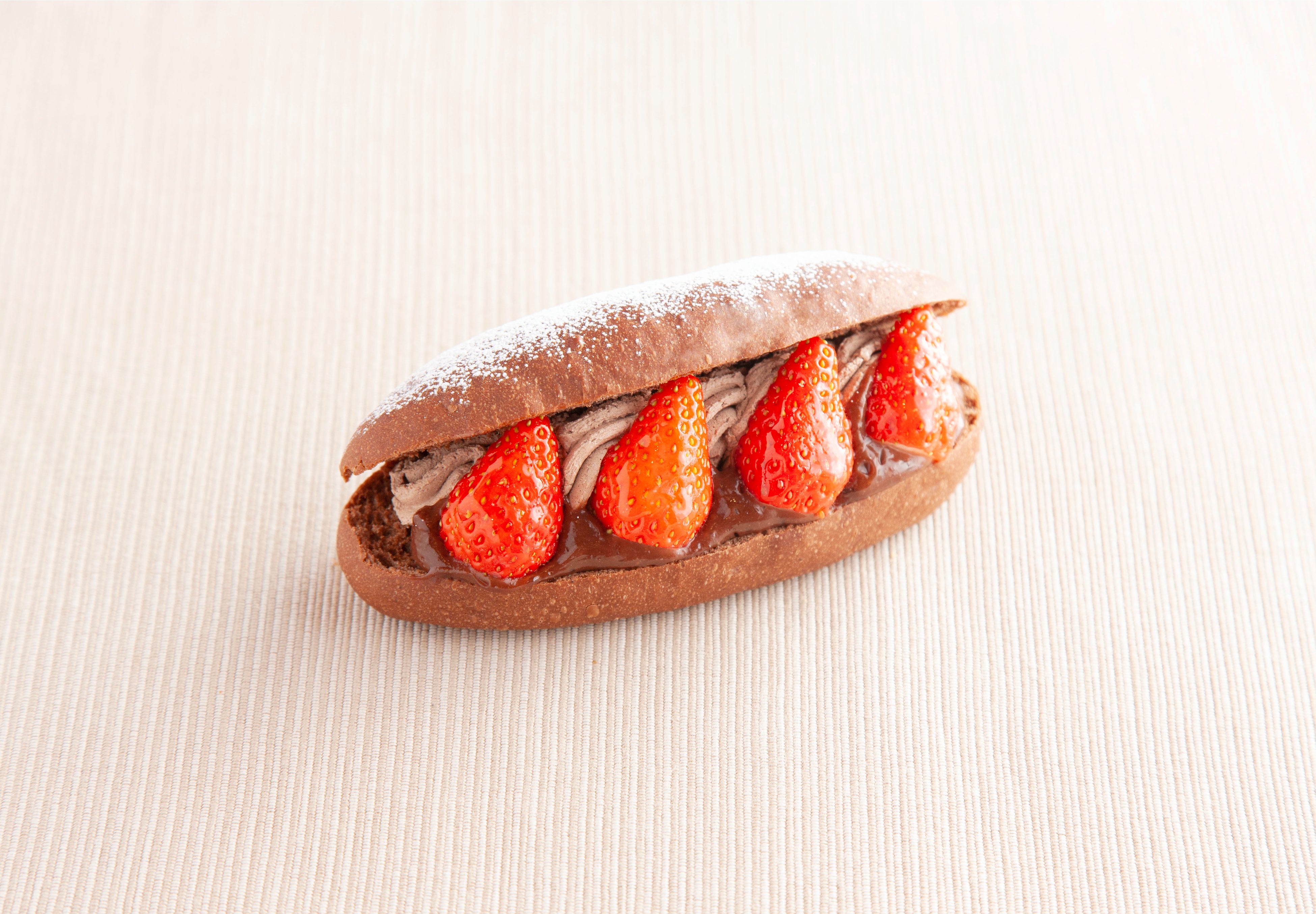 ココア生地のコッペパンにさっぱりとした甘さが特徴の三重県生まれのかおりのいちごとチョコホイップ・チョコクリームをサンド。甘酸っぱいいちごとチョコがよく合うスイーツコッペ。