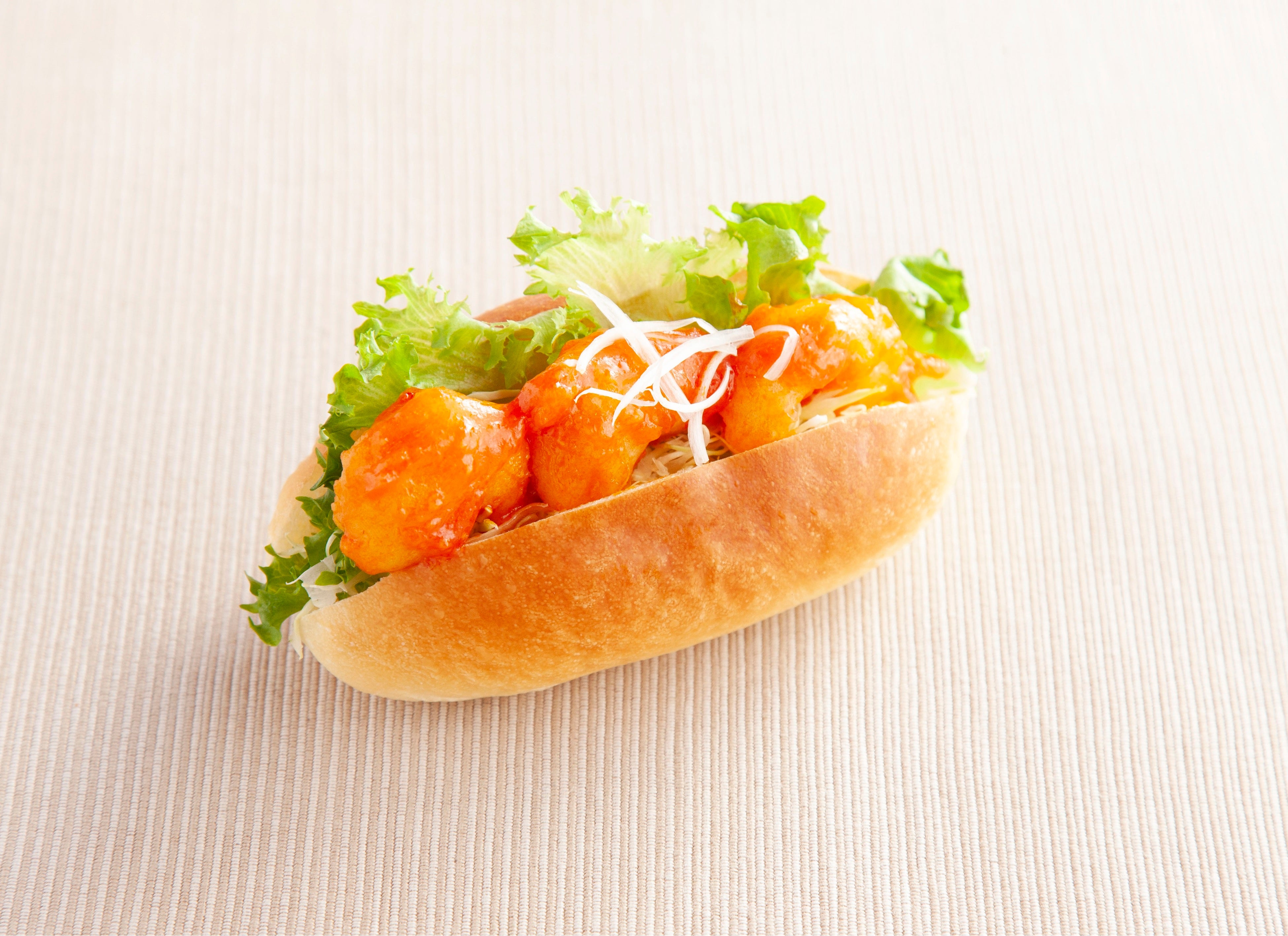 ぷりぷりの海老をたっぷりのキャベツと一緒にサンド。ふわふわコッペとエビチリの旨辛ソースがよく合います。