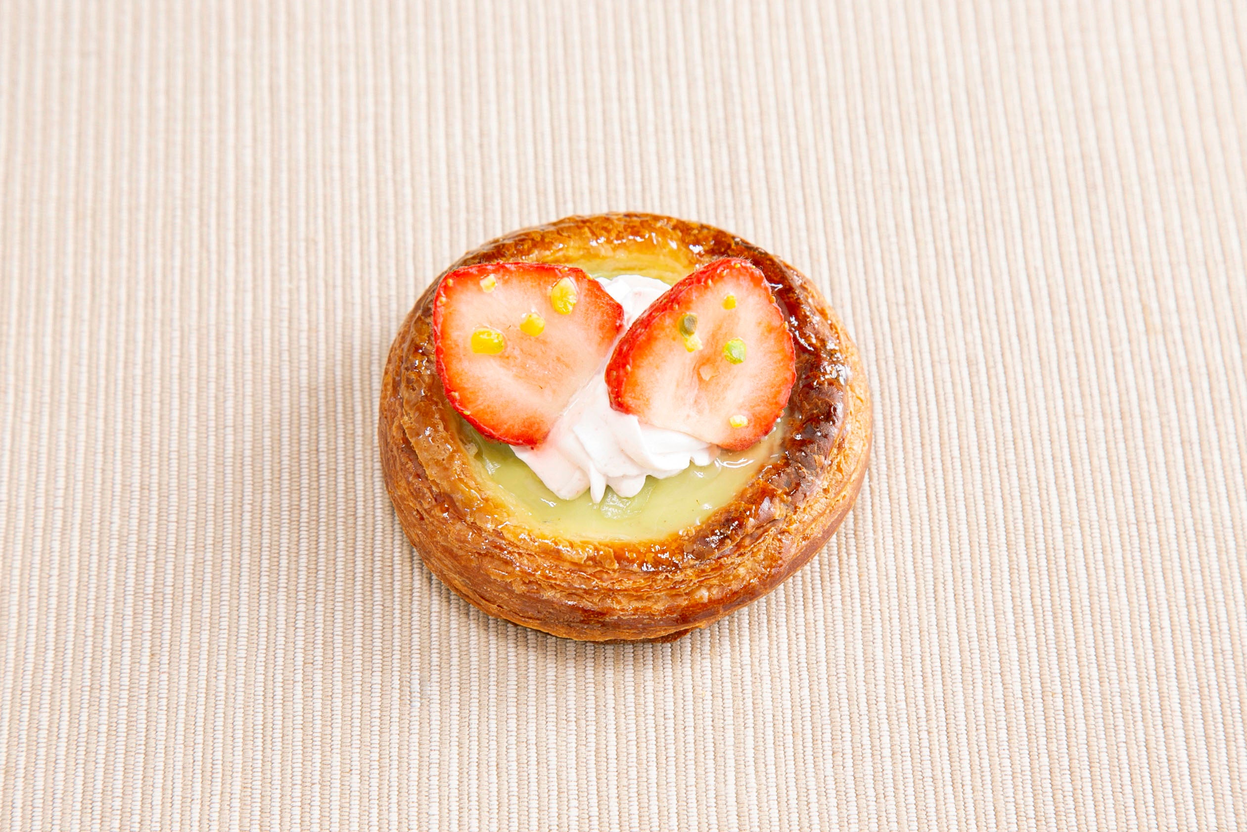 サクサクのデニッシュに風味の良いピスタチオクリームとストロベリーホイップを合わせ、つややかな赤色と甘さが特徴的なレッドパールをトッピング!レッドパールの真珠のような光沢と鮮やかな赤色を活かした高級感のあるデニッシュに仕上げました。