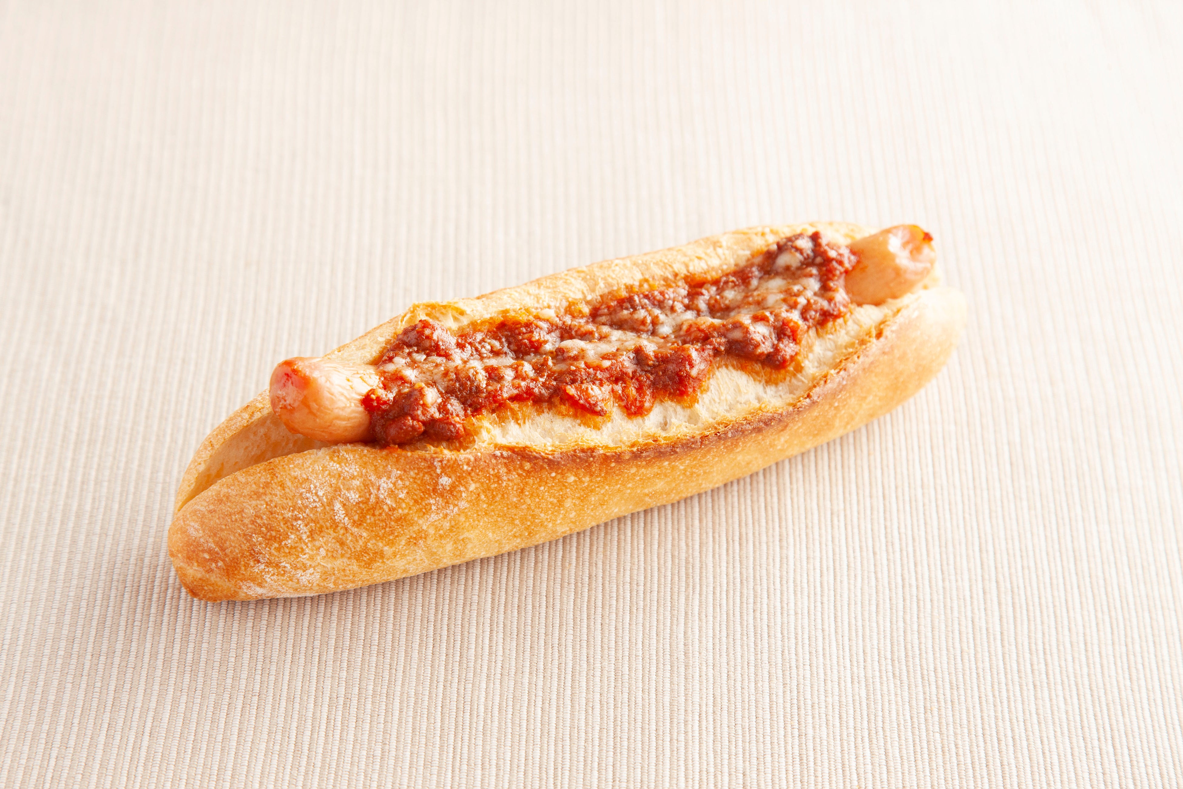 ぷりっとジューシーなソーセージにミートソースをかけ、食べ応え抜群のフランスパンに仕上げました。