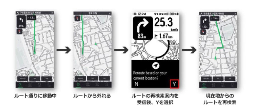 また、道から外れた場合も離脱防止機能がリアルタイムで正確に作動し、目的地に向かうための最善の新しい道をすぐに再探索します。