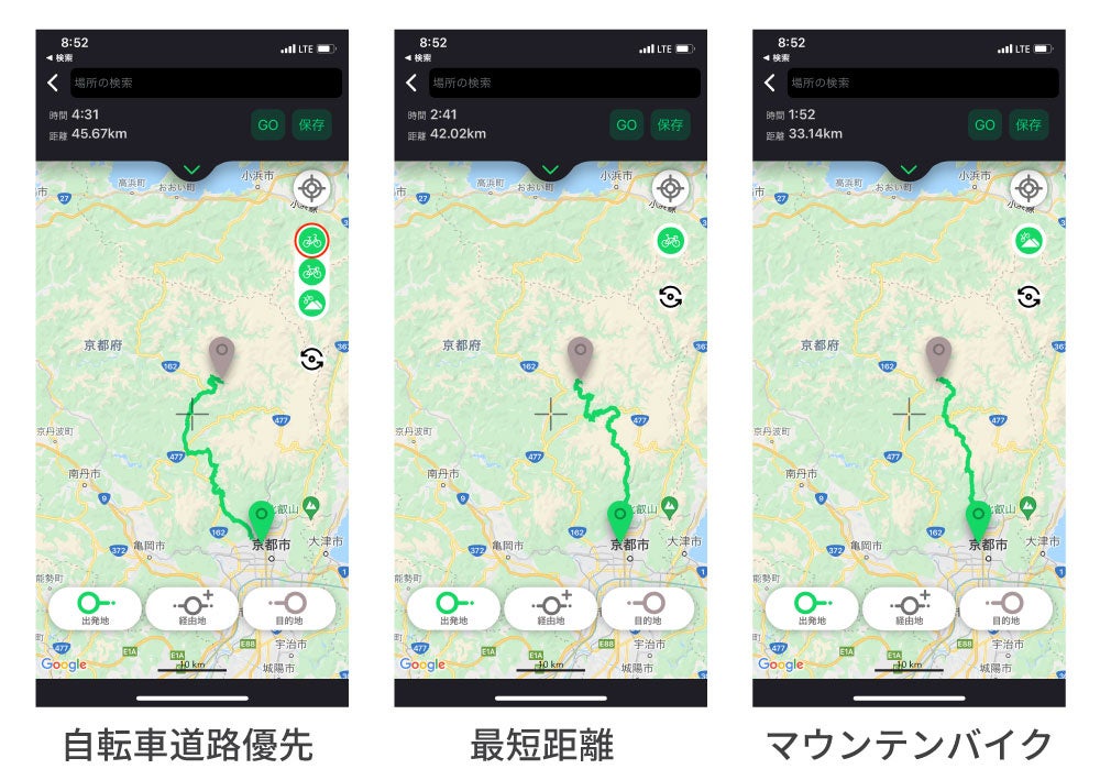 自転車道路モード(3種類)の変更により、同じ出発地と到着地の中でおすすめ経路を確認することができます。