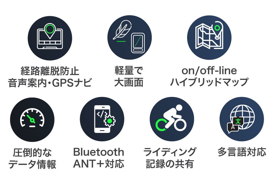 自転車の走行距離や時間、カロリー消費量の計測とGPS搭載による自転車専用ナビゲーション(経路再探索・音声案内)等を提供する『サイクルコンピューター』。