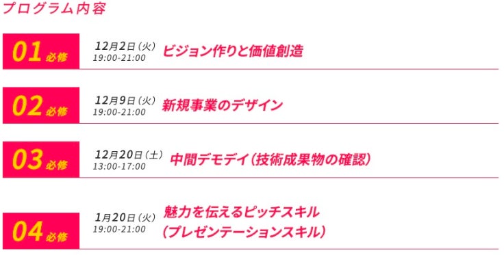 最新テクノロジーを学ぶとともに、ビジネスアイデアを創出し、創出したビジネスアイデアをブラッシュアップしていく一連の開発プロセスを経験することで、実践的なマインドとスキルを効果的に習得するプログラムです。