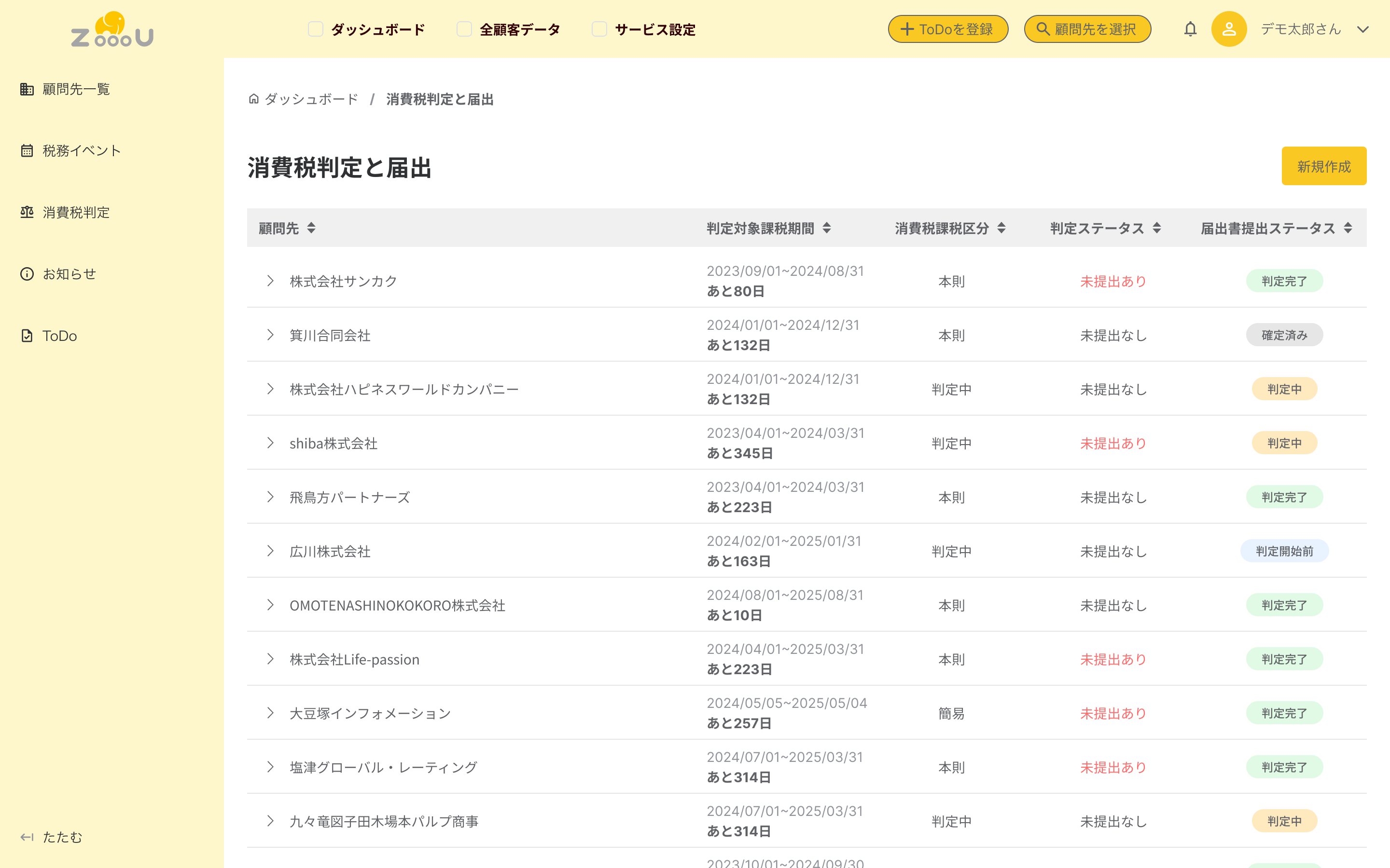 必要項目の入力をしていくことで、翌課税期間における消費税の納税有無や計算方式が判定されます。また、判定結果にもとづいた提出の必要な届出書 / 申請書が表示され、それらの提出状況や期日の管理をすることが可能です。さらに作成された消費税判定は一覧的に整理され、判定の結果や必要な対応について簡単に確認することができます。