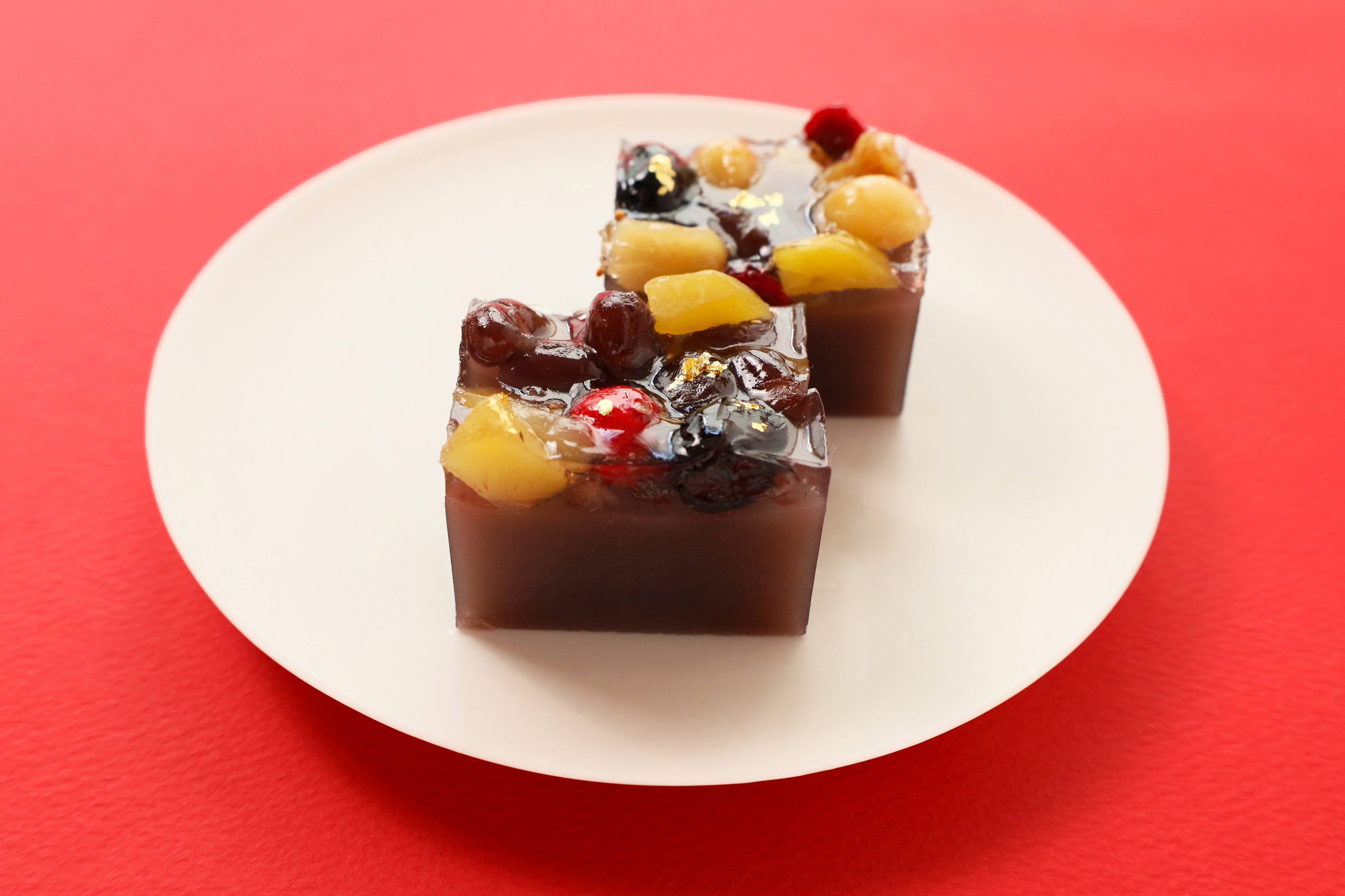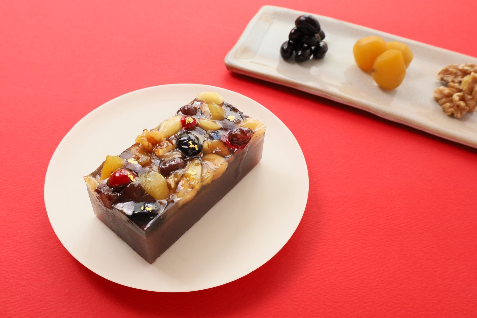 おせちに入っている黒豆・栗・くるみを中心に、梅に見立てたクランベリーや、食感がたのしいマカデミアナッツなど、羊羹としては少し珍しい素材ものっています。