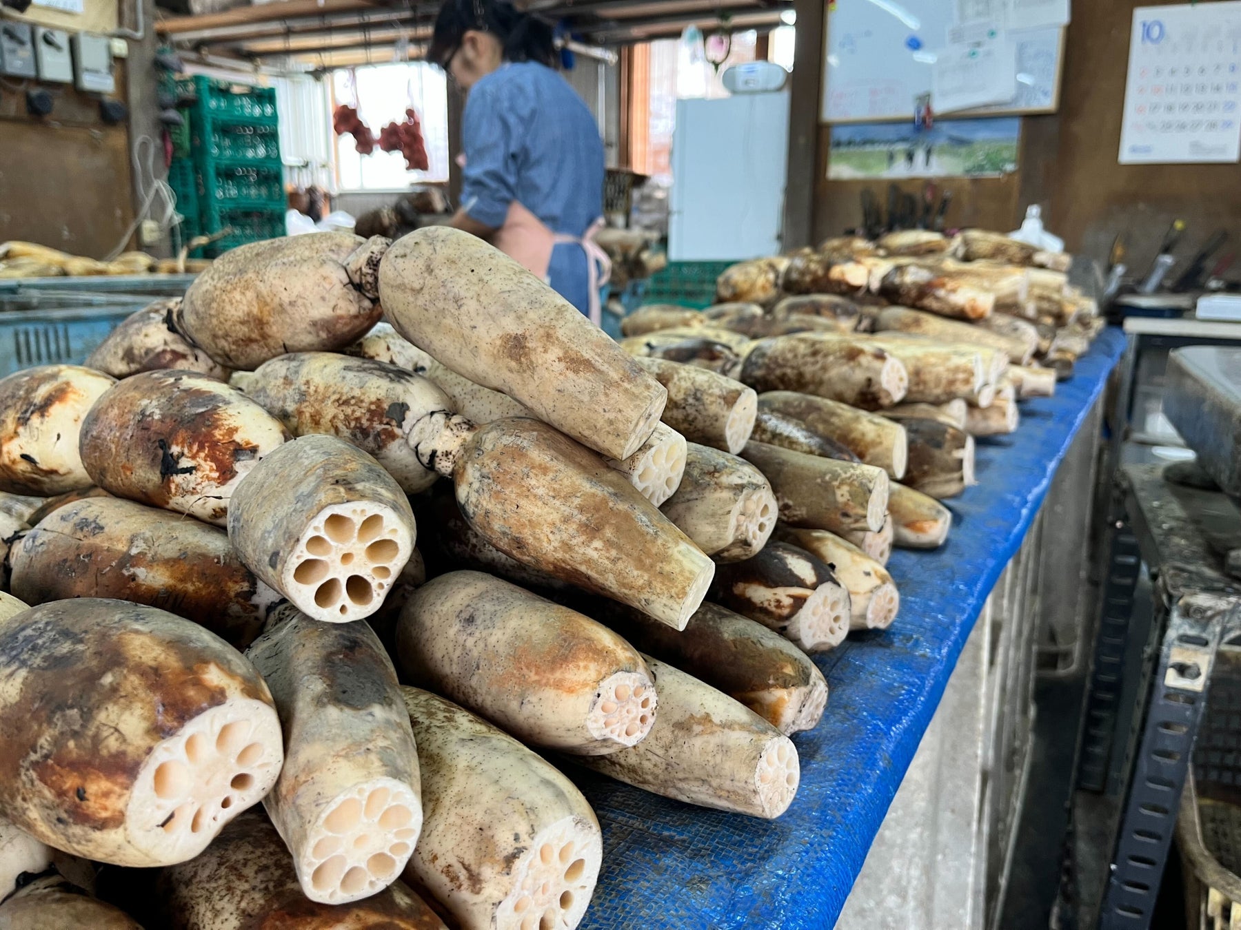 他県のものに比べると、節間が詰まった太くて締まった見た目。また、れんこんの穴が小さく、持って見るとみためよりもずっしりとした重量感があります。節によって料理法も変えていただくともっと美味しくいただけます。