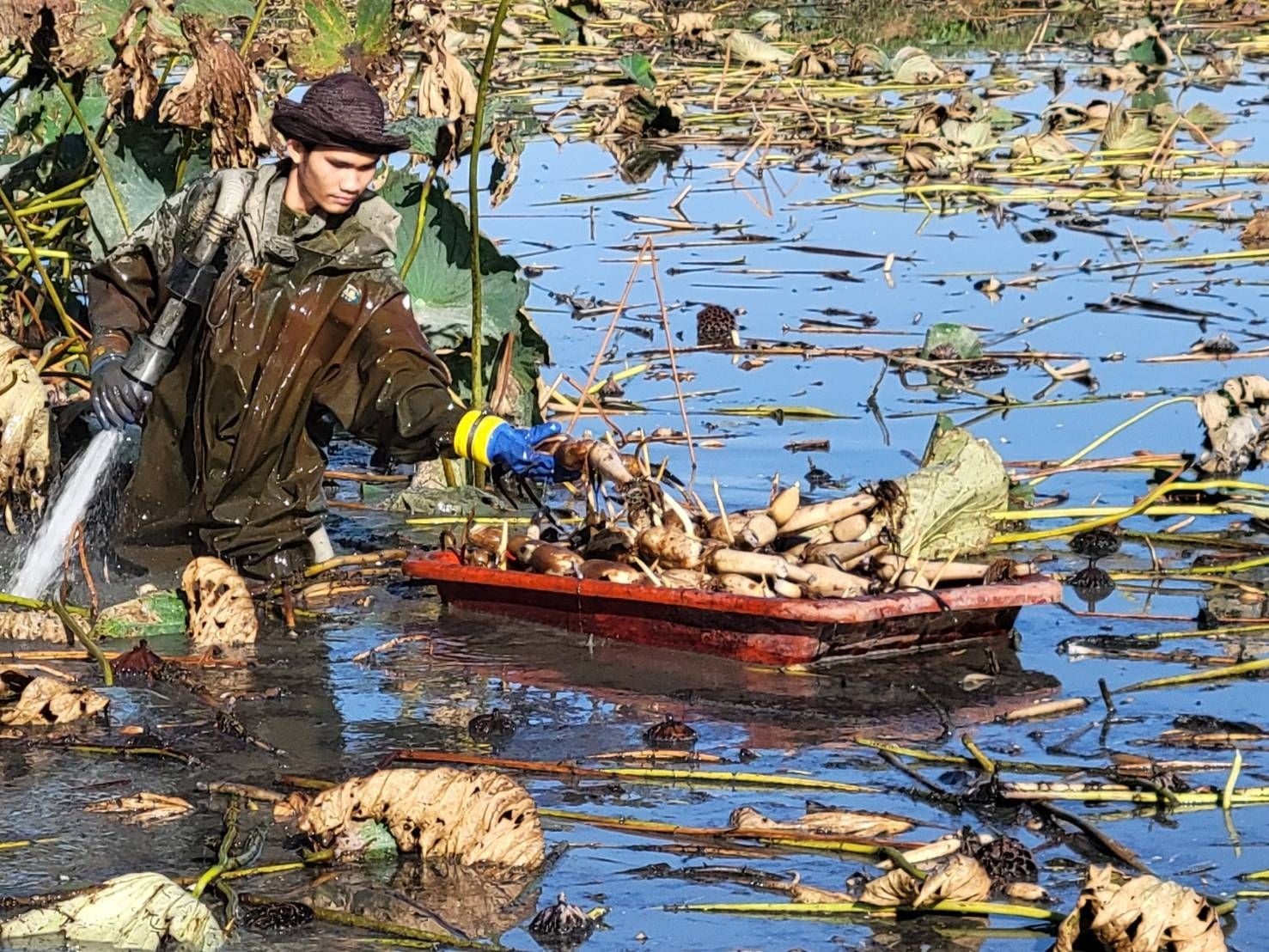 れんこんは通常あく抜きをすることが多いが、7,8,9月の早出しものは、でんぷん質が低く、さっと湯通ししたものは薄く切って刺身にとして食べられます。特にこの時期一番柔らかい先の一節が向いています。10月になり気温が下がってくると、大きな葉っぱが倒れてきます。これが農家の旬の収穫サインです。葉に貯めた養分が全て根に移行し、葉は倒れて、いよいよ秋冬野菜の本番です。