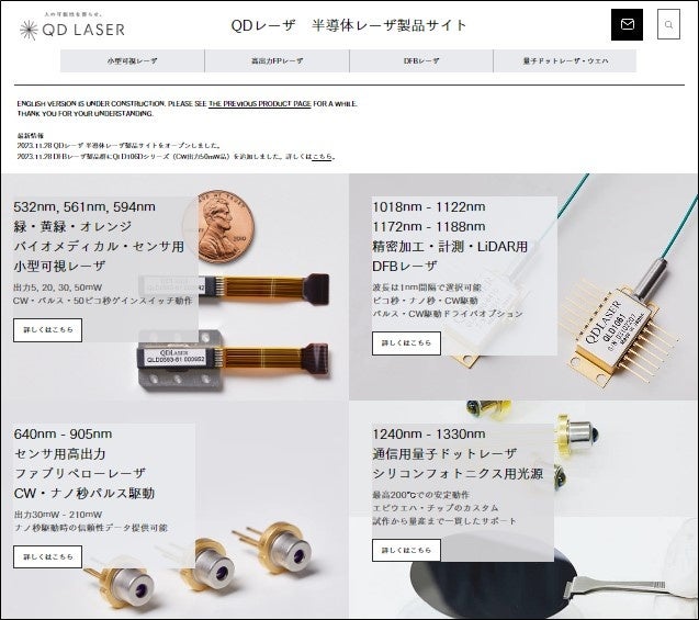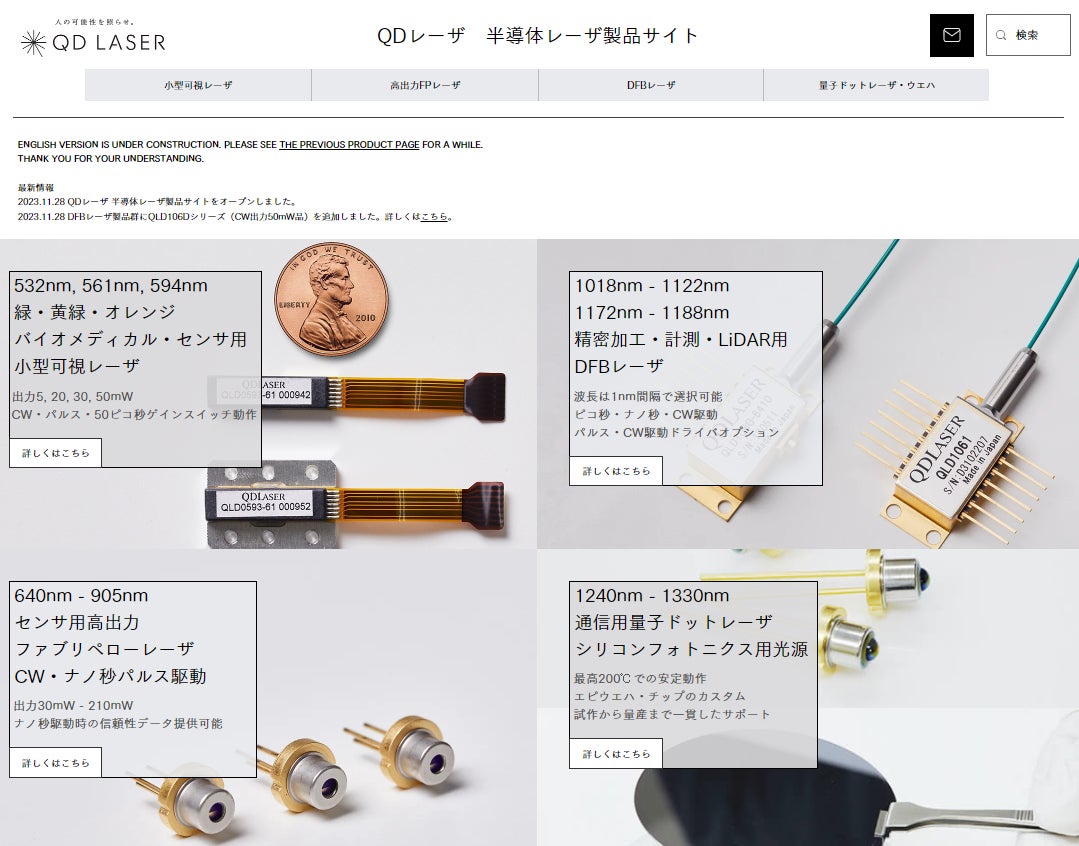 株式会社QDレーザ(本社:神奈川県川崎市、代表取締役社長:菅原 充、以下QDレーザ)は、2023年11月28日に半導体レーザ製品専用のウェブサイト(https://www.qdl-laser.com/)を開設いたしました。今後、QDレーザの半導体レーザ製品(小型可視レーザ、高出力FPレーザ、DFBレーザ、量子ドットレーザ、エピタキシャルウエハ、ファウンドリサービス)の仕様や最新情報は、同サイトにて更新いたします。QDレーザの半導体レーザ製品をお求めのお客様にとって、見やすい・わかりやすいサイト作りを心がけてまいります。同サイトのご利用をお待ちしております。