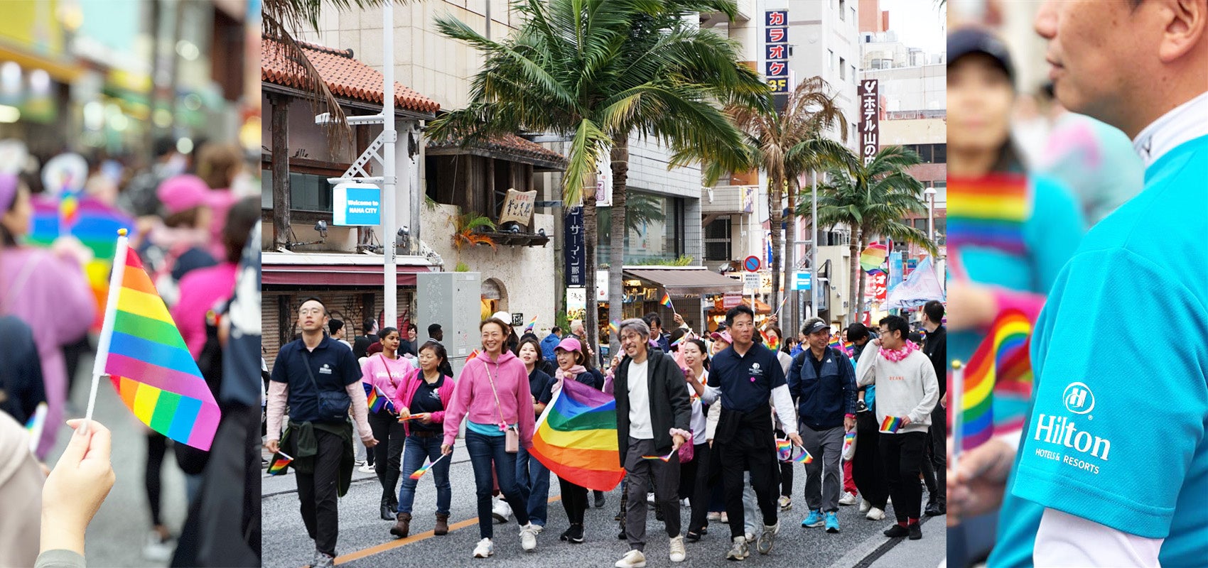 今回の参加は、ヒルトンのLGBTQのチームメンバー(従業員)をサポートする社内の有志グループ「プライド・TMRG(チームメンバー・リソース・グループ )」 の活動の一環として実現しました。ヒルトン沖縄北谷リゾート、ヒルトン沖縄瀬底リゾート、ヒルトン沖縄宮古島リゾート、ダブルツリーbyヒルトン沖縄北谷リゾート、ダブルツリーbyヒルトン那覇首里城、ダブルツリーbyヒルトン那覇の計6ホテルが参画し、参加者はピンク色のアイテムを身に着け、誰もが自分らしく生きられる社会の実現を目指して沖縄県の国際通りを行進しました。