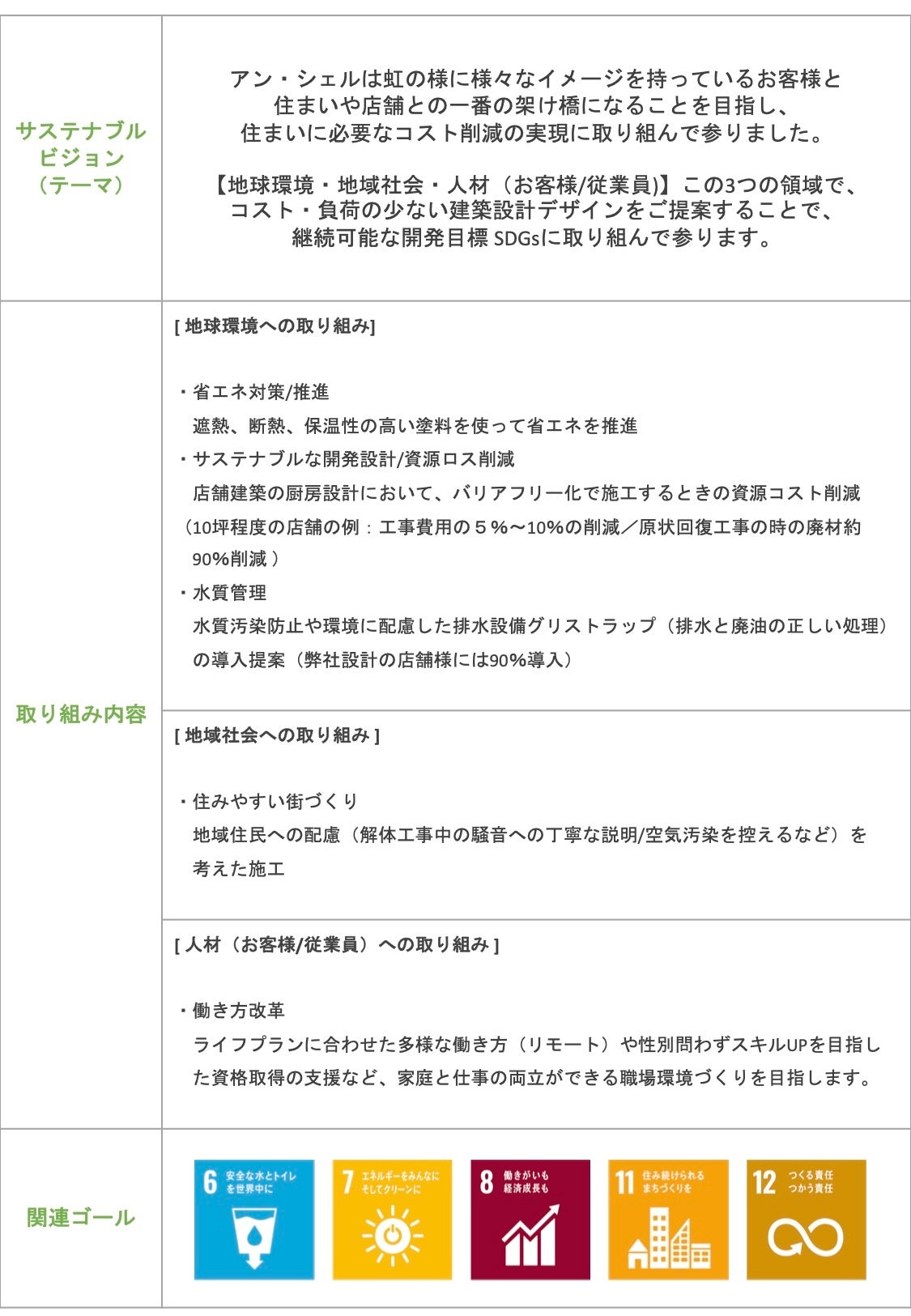 アン・シェル株式会社 (所在地:兵庫県芦屋市 代表取締役:末谷一郎) は、SDGsに取り組む企業を対象としたサステナブル経営支援サービスを提供する一般社団法人日本ノハム協会 (代表理事:神田尚子) とメンバーシップを締結し、環境/社会/経済への負荷の少ない建設業(店舗設計/デザイン/施工)を目指したサステナブルビジョンを掲げ SDGs を推進しています。
