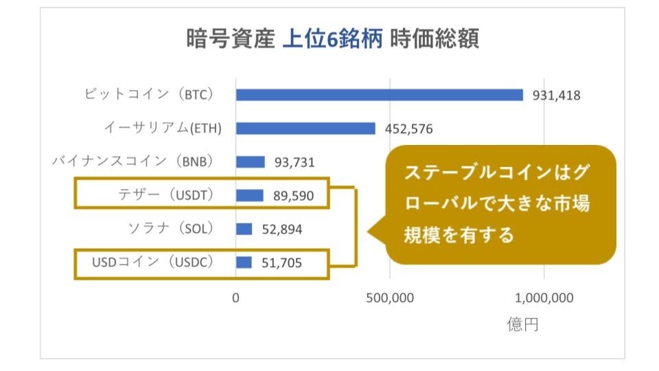 主に裏付け資産を持つことで1ドル=1コインのように法定通貨と価格が連動する「ステーブルコイン」は、海外で発行されるパーミッションレス型(発行者による特段の制限なく、ブロックチェーン等を通じて不特定者の間で転々流通する)のものを主流とし、国際的な時価総額が主要銘柄で合計7兆3000億円を超えています。これらは230兆円の市場規模を持つ暗号資産の価格変動に対するリスクオフ資産・基軸通貨としての機能やNFTなど、ブロックチェーンを用いた新業態・ビジネスに用いられる様々な可能性を持ち、海外では決済大手のPayPal社が開発を検討するなど注目されていますが、日本では法規制のもとに取り扱いが実現していません。