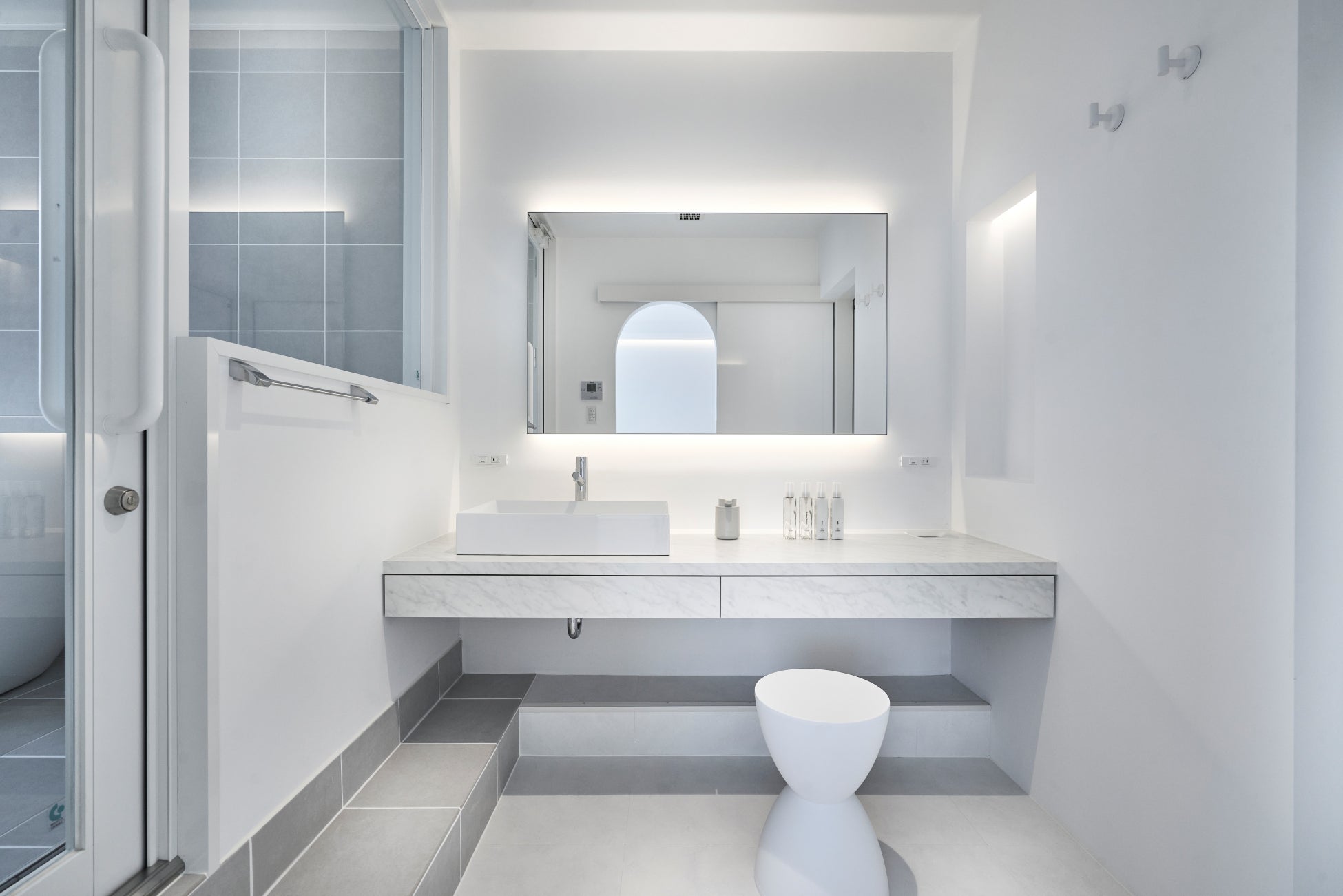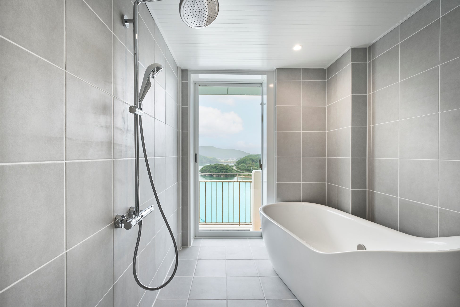 安心感を与えると言われている白色。角部屋の特等席に設えられ、大きな窓とガラス張りのバスルームからは、時間とともに移ろう海景を臨み、まっさらな気持ちで日常の忙しさをリフレッシュする安らぎのひとときをお過ごしいただけます。