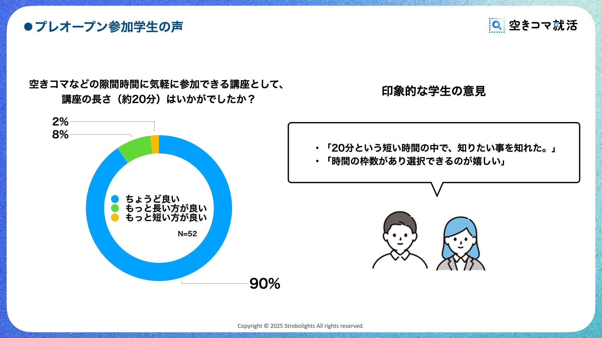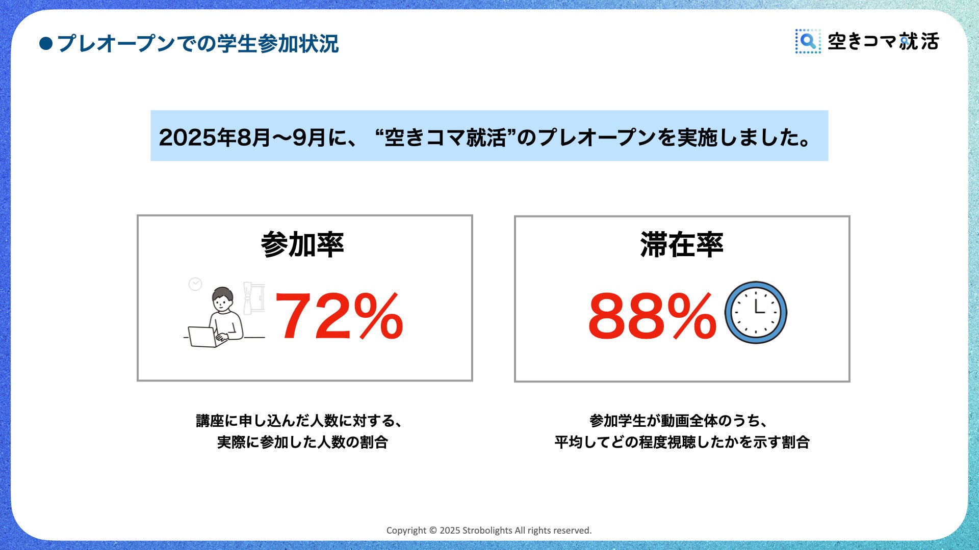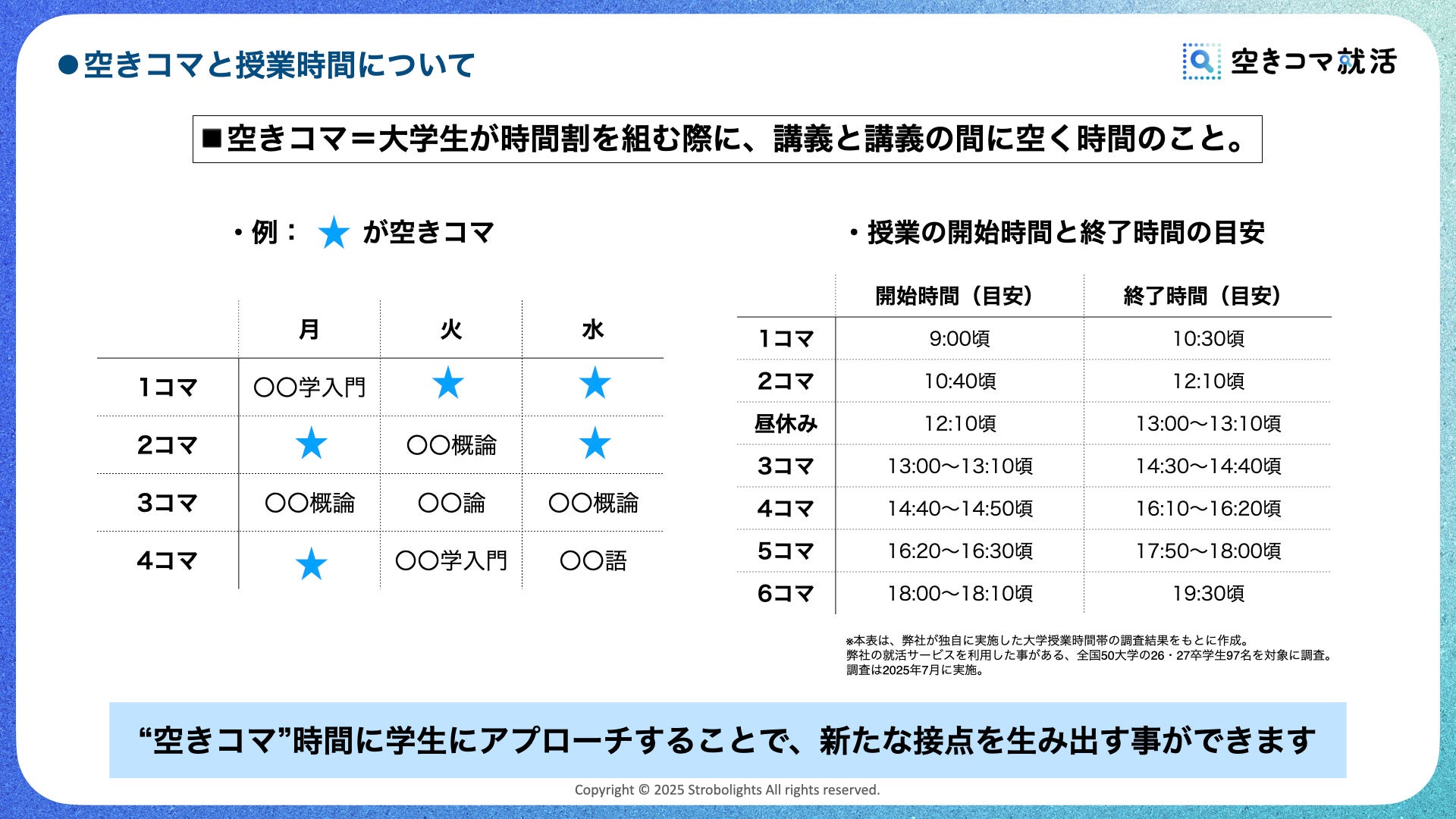 株式会社Strobolights(本社:東京都町田市、代表取締役社長:羽田啓一郎、以下Strobolights)では学生の授業の合間やアルバイト・部活動の隙間時間=「空きコマ」を活用し、企業説明会の視聴を可能にする新しい動画配信サービス「空きコマ就活」を2025年10月31日(金)より提供開始します。