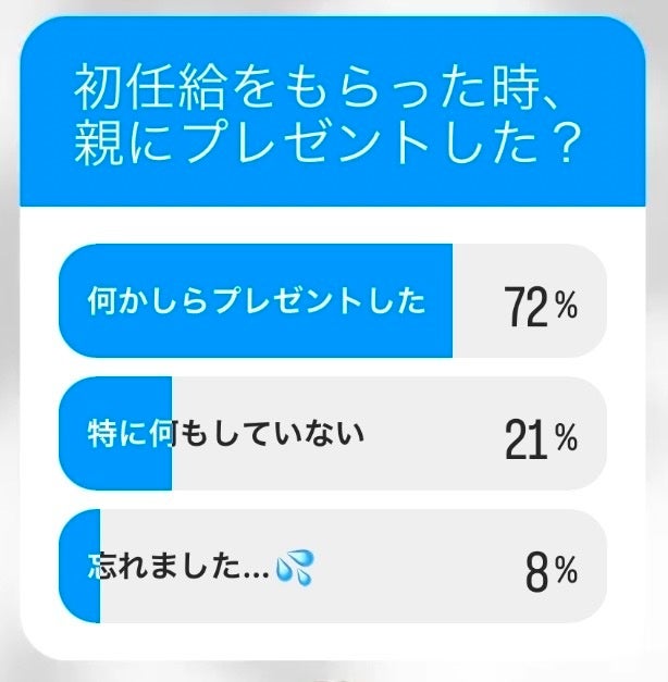 などの回答をいただいたのですが、初任給で家族へプレゼントを考えて実行した方が多いことが改めてわかりました。
