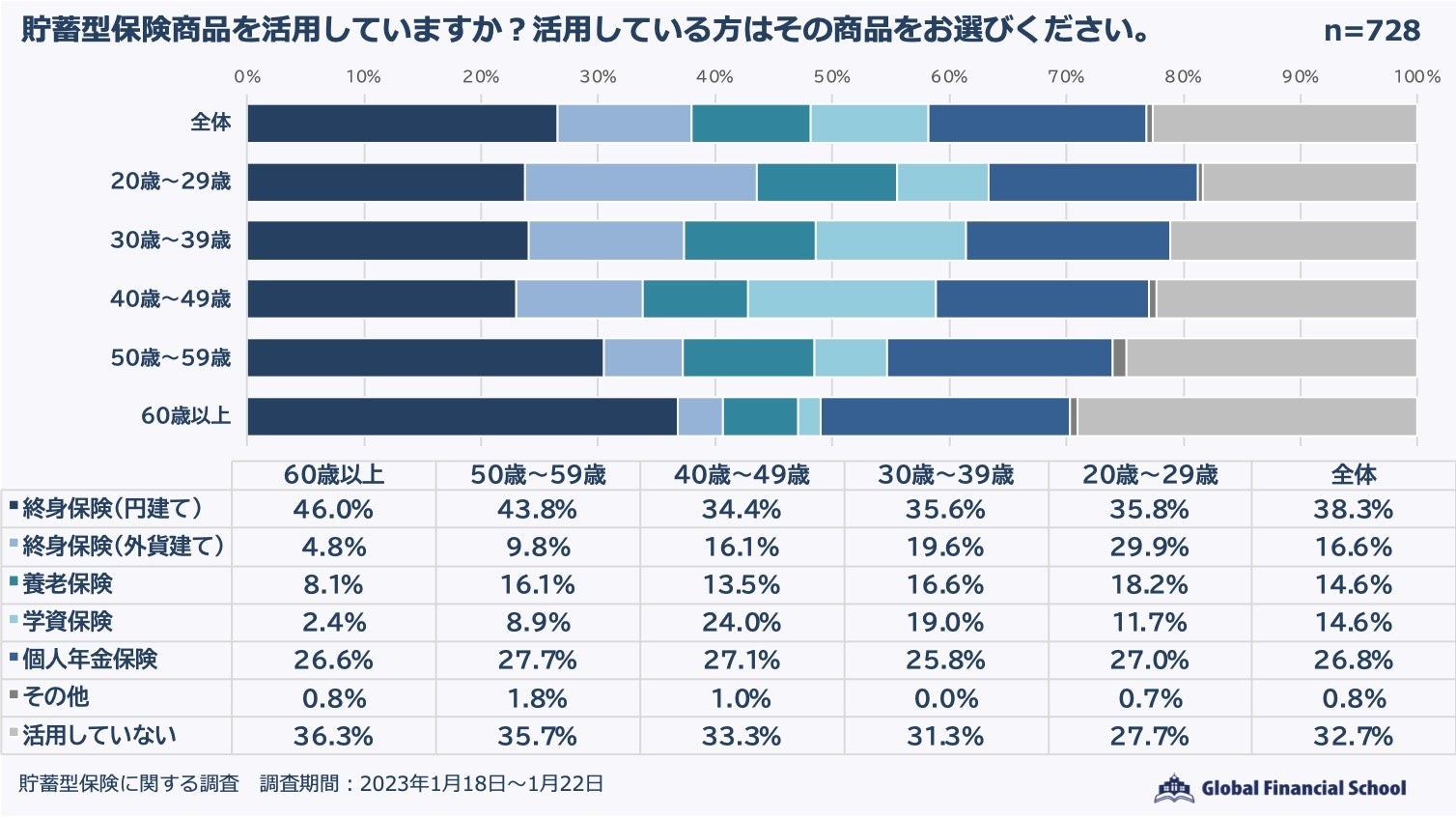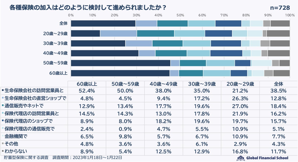 業界最多の講座数を誇る日本最大規模の金融オンラインスクール「グローバルファイナンシャルスクール」(以下略:GFS、東京都港区、市川雄一郎校長)は、全国20〜60代で、何かしらの民間保険に加入していると答えた男女728名に対してアンケートを行いました。 保証と資産運用を両立できることから、将来を考えて加入している人も多い「貯蓄型保険」の、年代によって傾向の異なる加入実態や、貯蓄型保険を含む保険商品の加入方法に関する実態が浮かび上がりました。