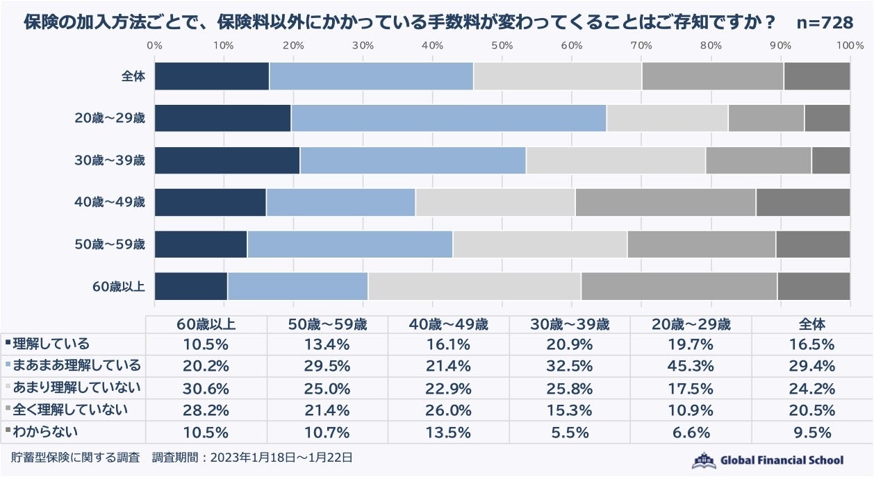 保険の加入方法によって、かかる手数料の設定が変わってくることを理解していると答えた人は計45.9%となり、半数以上が理解できていない、わからないと回答。いっぽう20代(65.0%)と30代(53.4%)では、半数以上の人が手数料のことを理解していると回答しました。