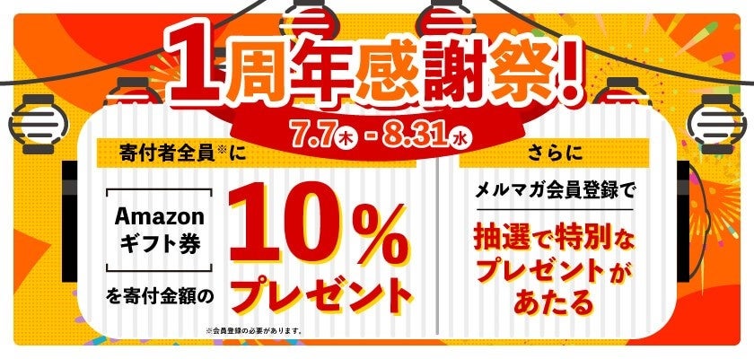 朝日放送テレビ株式会社(本社:大阪市、代表取締役:山本 晋也)が運営するふるさと納税サイト「ふるラボ」では、日頃のご愛顧に感謝して1周年感謝祭を開催いたします。期間中、会員登録頂いた寄付者全員に寄付金額の10%のAmazonギフト券をプレゼント!面倒な手続き不要でキャンペーンにご参加いただけます。