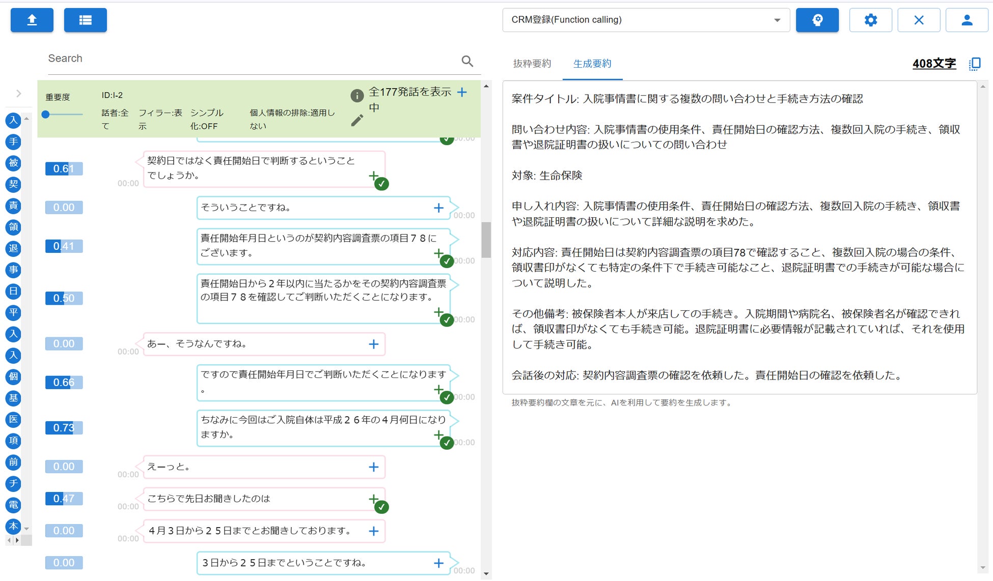 音声認識テキストに対して、重要度の判定やクレンジング、個人情報の特定を自動で行い、生成AIを利用する前に文章を自動で正規化します。また、個人情報をあらかじめ除外することで、生成AIに個人情報が渡ることを防ぎ、安全に利用できるようにします。