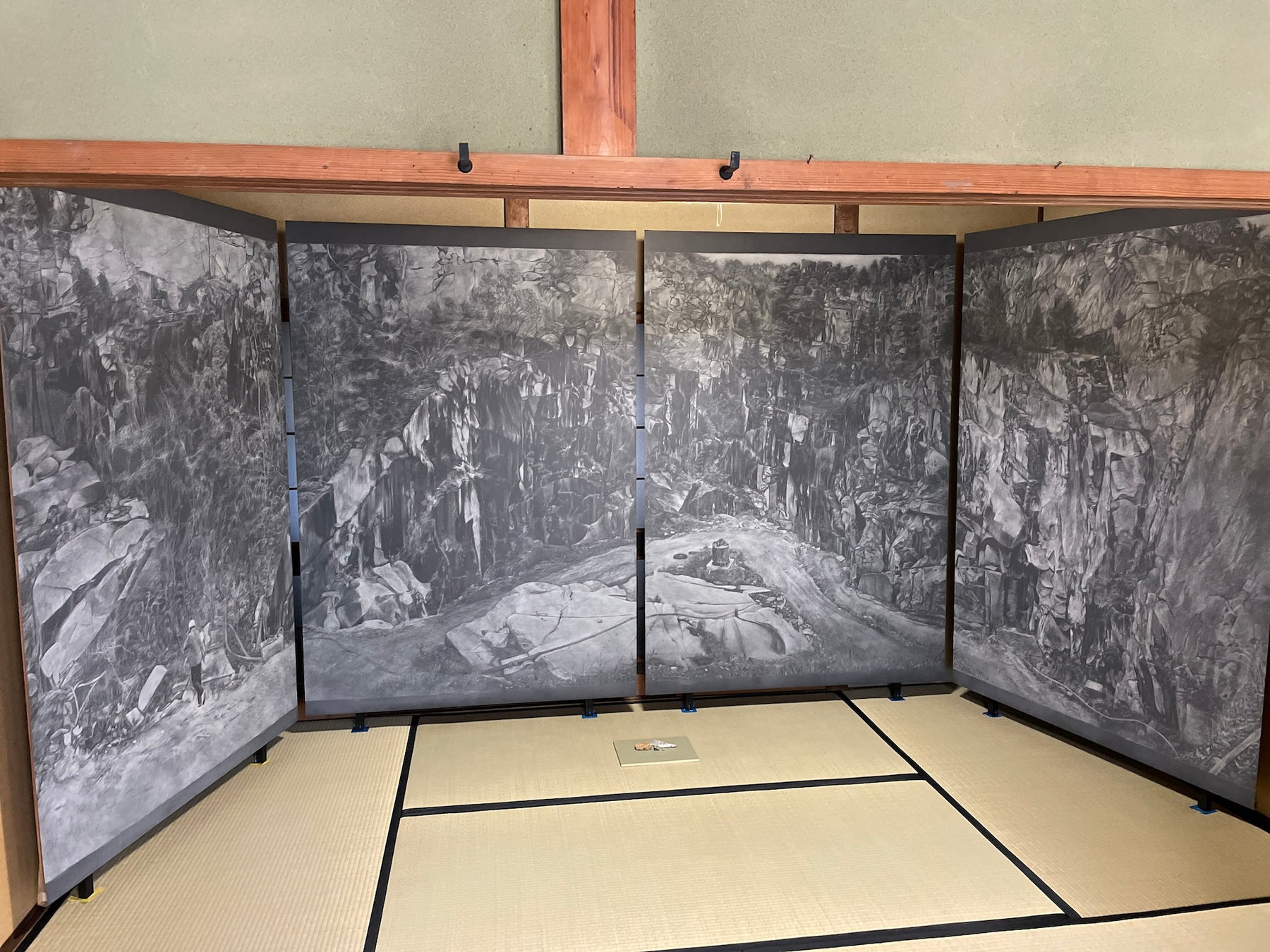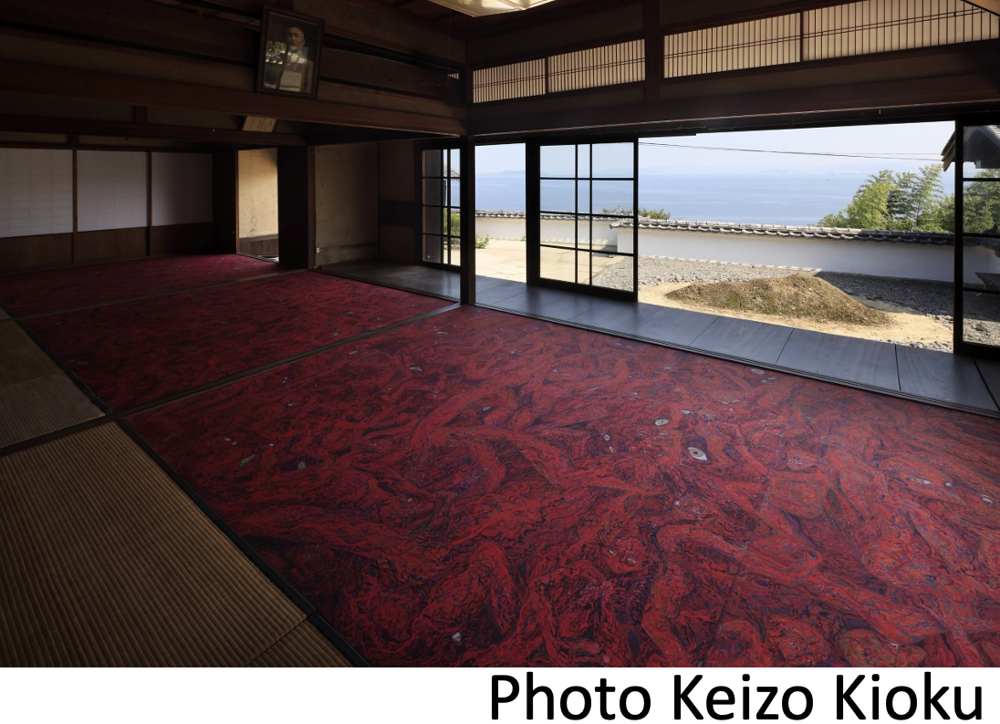 「中塚邸」という古い日本家屋の畳を剥がし、ろうけつ染めで無数の人間を描いた作品。描かれた人間は、人種や性別を超えたものとして表現されている。2階には、押し入れの襖や天井の隙間から無数の目が覗き、かつての人の気配を感じさせます。