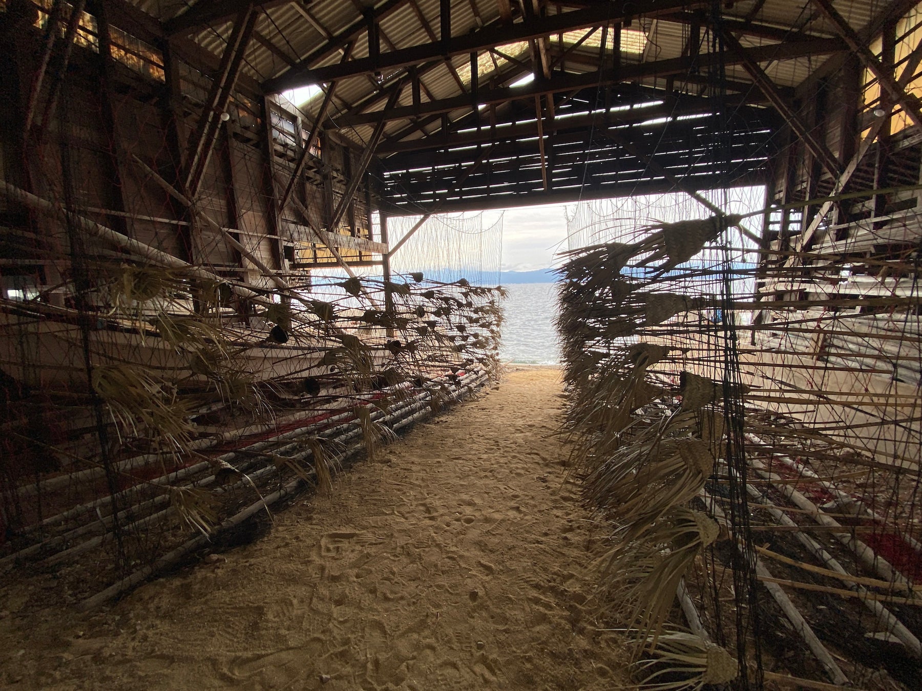 アラビア湾岸文化圏で行われる船乗りの無事を祈って、女性らがナツメヤシの葉で編んだ篭に火を灯し、海につけて鎮めるという祈りの儀式をモチーフにした作品。伊吹島の景色の美しい場所にある旧造船所につくられたインスタレーション作品です。