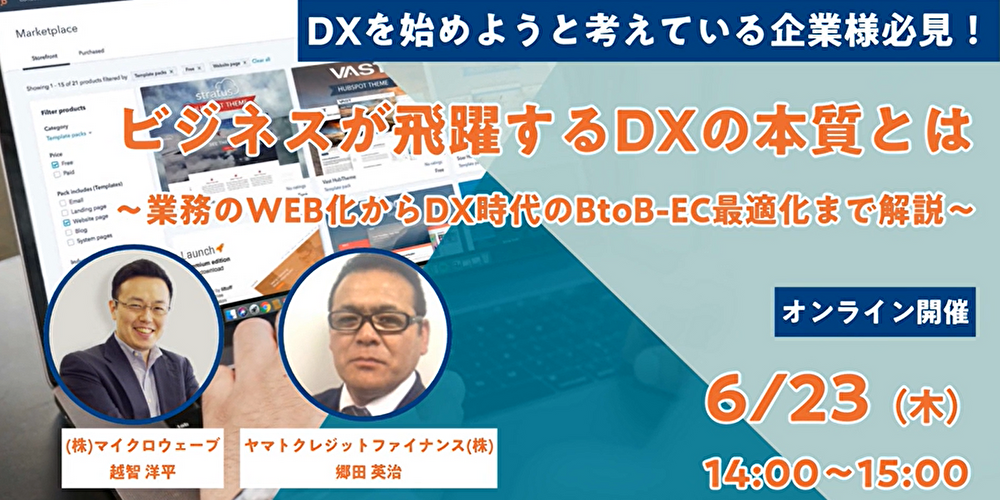本セミナーでは、ECサイトやシステム構築を手掛けているマイクロウェーブと、企業間決済の代行サービスを提供するヤマトクレジットファイナンスが、業務のWEB化からDX効果の高いBtoB-ECの最適化について事例を交えてお話しし、企業のDX戦略を成功させるポイントについて分かりやすく解説いたします。
