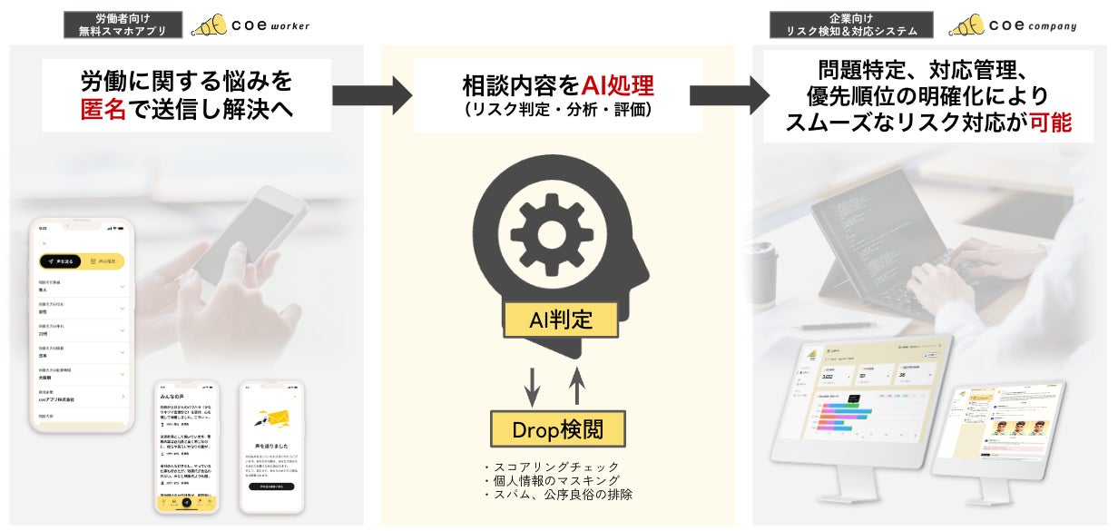 coeには2つのサービスがあり、労働者個人が企業に声を送るために利用するスマホアプリがcoe workerで、企業が労働者個人の声を集めて対応するためのサービスがcoe companyです。