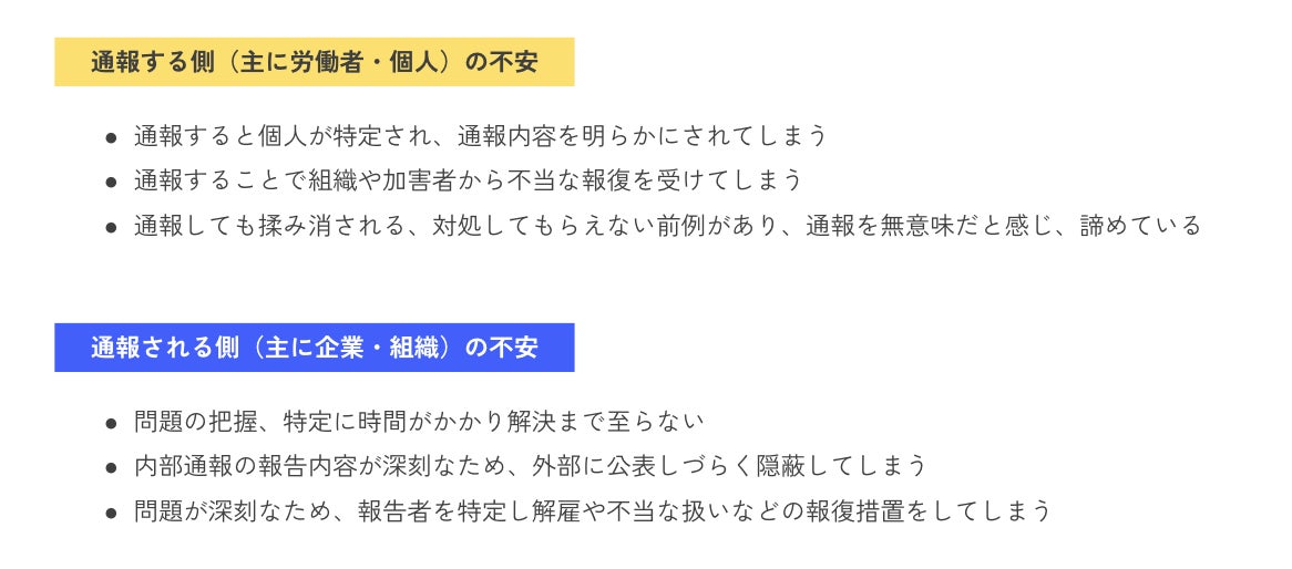 多くの内部通報の仕組みでは、それぞれに以下のような不安を抱えています。