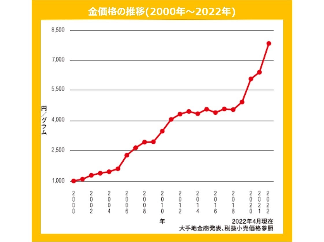 2年前から上昇を続けていた金相場は、コロナ危機を起点に各国の金融緩和や政府の財政出動などの影響を受け、高値安定で推移していました。その中、世界情勢が大きく揺らぎはじめたことを受け、現物資産への期待がより一層高まったことにより、4月20日には過去最高値8,969円(大手地金商発表税込小売価格)を記録しました。この不安定な状況は今後も続くと見られており、「金」への注目は継続するといわれています。