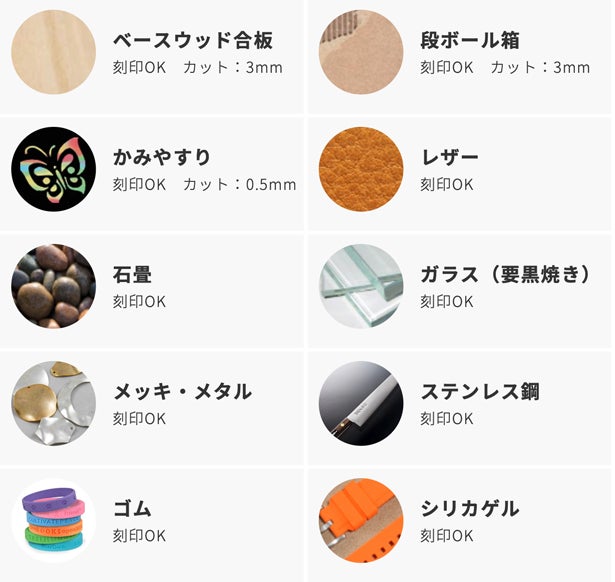 彫刻対応可能な素材例:MDF/レザー/石/メッキ・メタル/シリカゲル/PVC/ゴム/ステンレス鋼