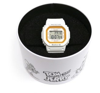 トムとジェリー初のBABY-Gとのコラボレーション商品です。真っ白なボディとベルトにはトムとジェリーが楽しく追っかけっこをしているようなイラスト、そしてチーズ色のオレンジがアクセントになった、シンプルで色々なファッションにも合わせやすいデザインです。ライトを点灯させるとTOM and JERRYのロゴが浮き上がったり、トムとジェリーが描かれた箱の中に丸型の缶がパッケージになっていたりと、こだわりつくされ、自分で身に着けることももちろん、プレゼントとしてもおすすめの逸品です。