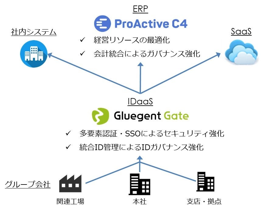 会計、人事給与、経費、勤怠管理などのフロントオフィス・バックオフィス業務システムで構成されるクラウドERP「ProActive C4」に「Gluegent Gate」の認証連携機能を加えることにより、グループ会社やサプライチェーン全体で使用するその他の社内システムや各種クラウドサービスを含めた認証セキュリティを統合的に高めることができます。