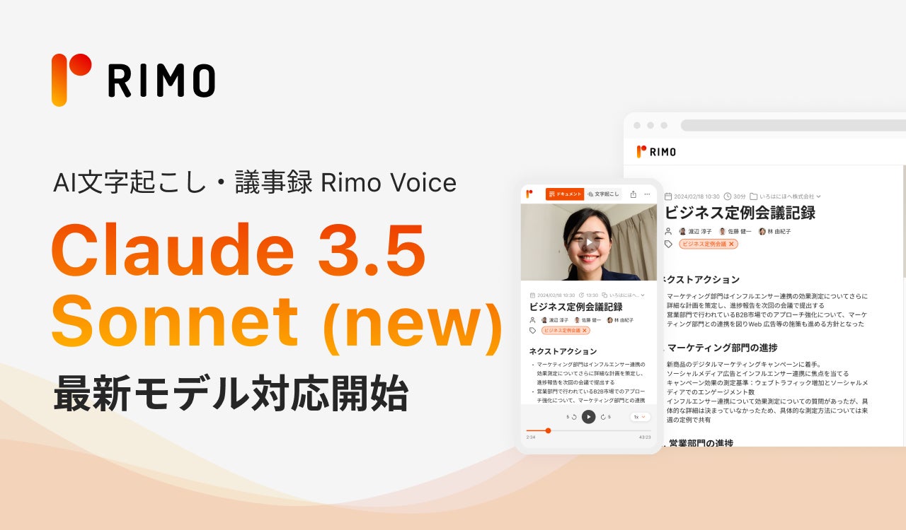 AI議事録サービス「Rimo Voice」、本日リリースの最新モデル「Claude 3.5 Sonnet (new)」に対応開始