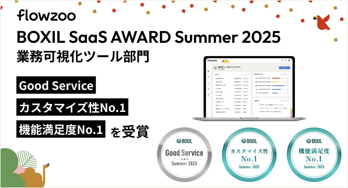 業務管理システム「flowzoo」、「BOXIL SaaS AWARD Summer 2025」業務可視化ツール部門で「Good Service」「カスタマイズ性No.1」「機能満足度No.1」を受賞