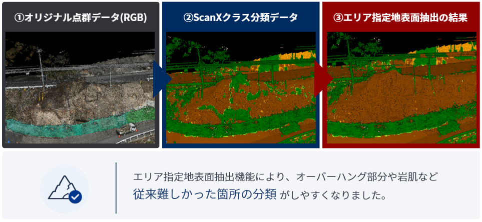 また、これまで対応が難しかったオーバーハング地形についても、適切な地表面抽出が可能になります。