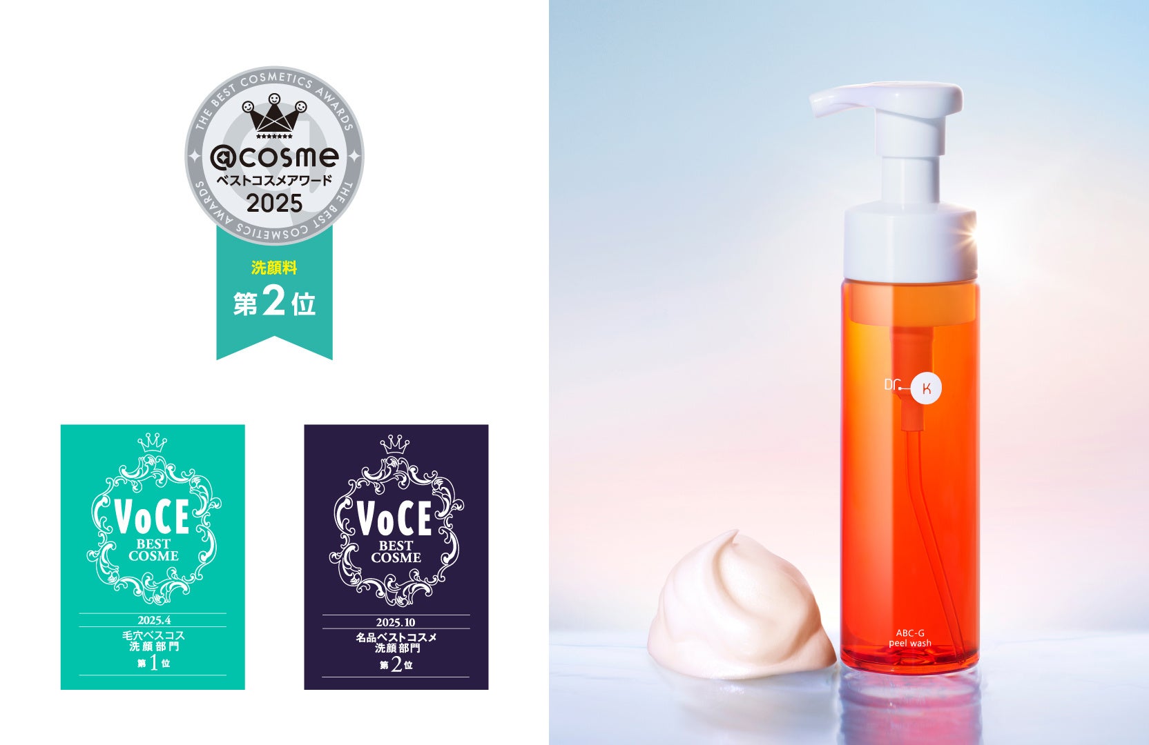 2025年は、同年1月発売のリップ美容液「ABC-Gリップセラム クリア」がベストコスメ18冠*、7月発売の毛穴*・エイジングケア特化型ビタミンC*美容液「Cコントロールリペアセラム」が24冠*を獲得。さらに、昨年7月発売の角質ケア泡洗顔「ABC-Gピールウォッシュ」は累計41冠*を達成するなど、多数の媒体で高い評価をいただきました。