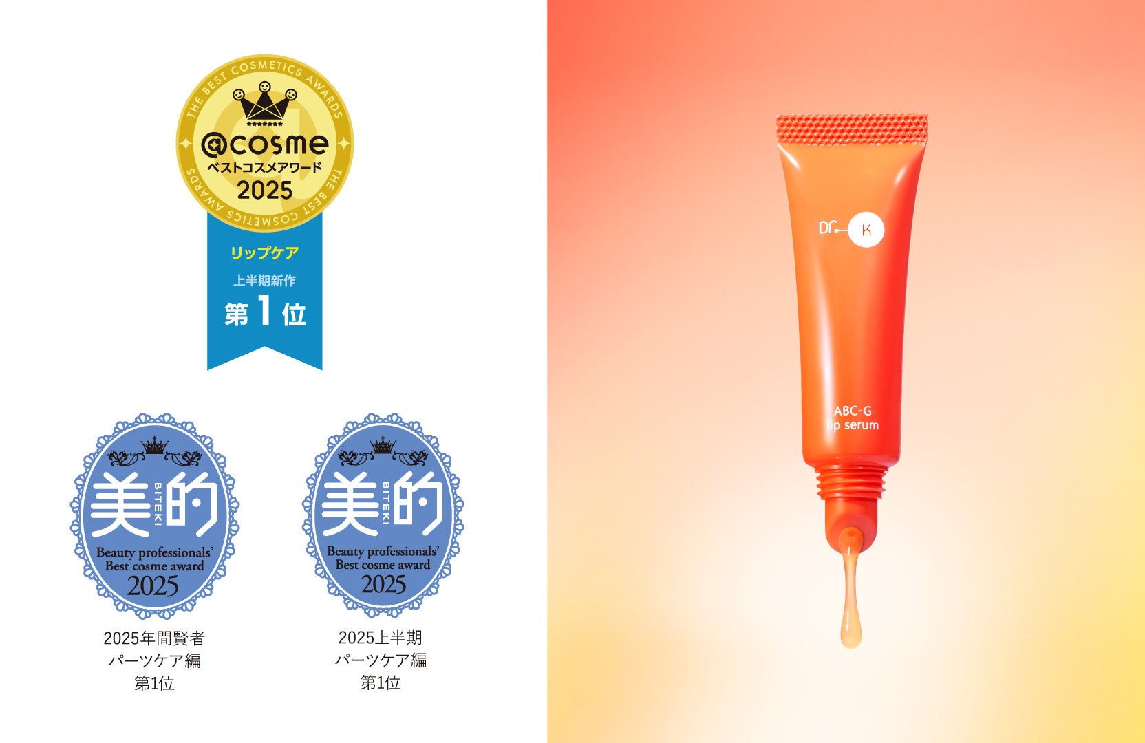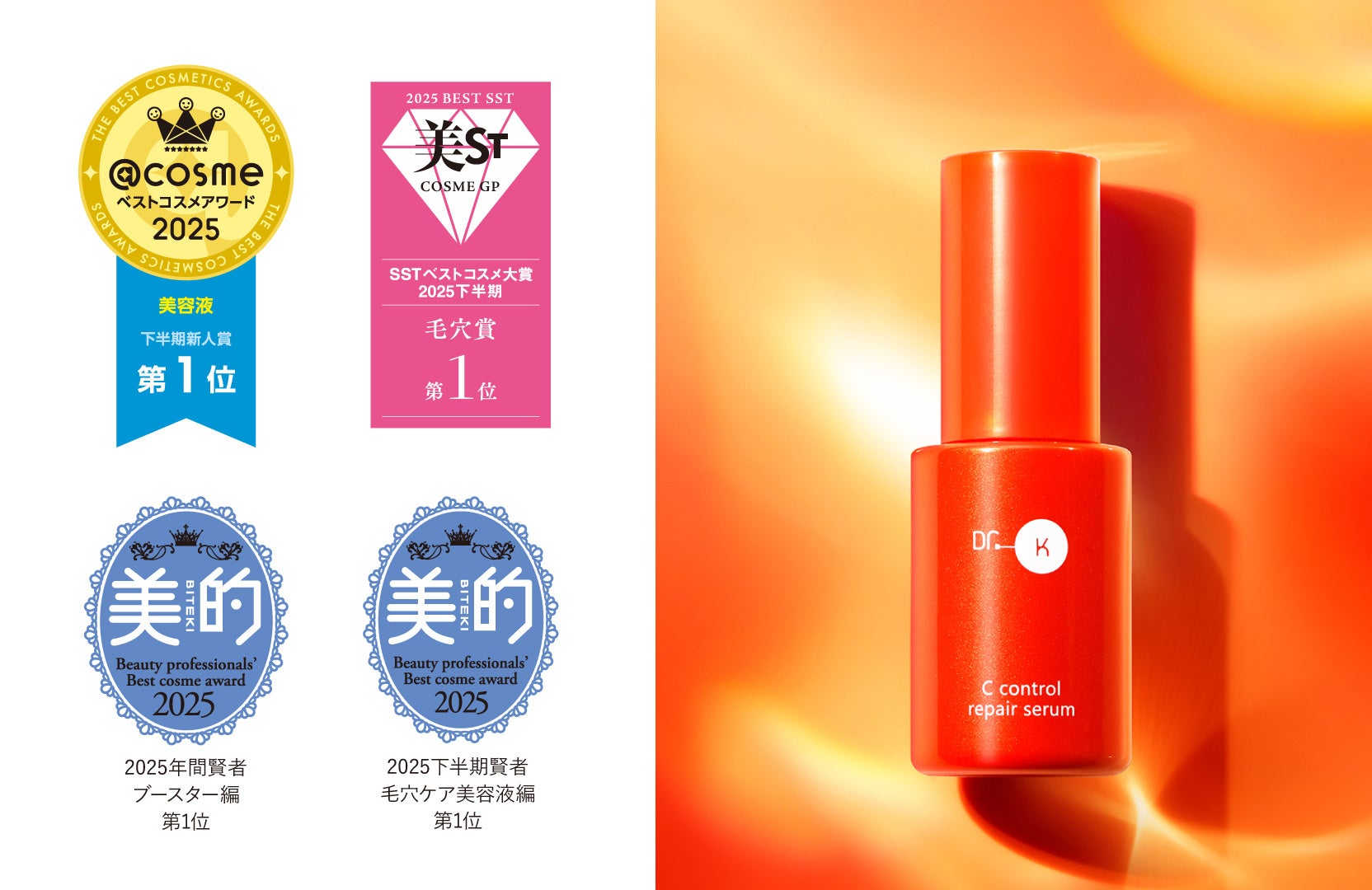 株式会社ドクターケイ(本社:東京都港区)が展開する、ビタミンを科学するスキンケアブランド「Dr.K(ドクターケイ)」は、2025年7月22日(水)発売の毛穴*・エイジングケア*特化型ビタミンC*美容液「Cコントロールリペアセラム」をはじめとする複数製品において、『美的』『VOCE』『MAQUIA』や、日本最大級のコスメ・化粧品・美容の総合情報サイト『@cosme』などで、2025年ベストコスメを受賞。