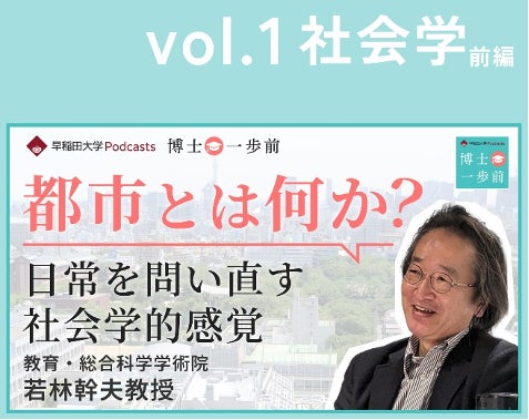 第一弾シリーズとなる番組「早稲田大学podcasts:博士一歩前」は、2024年4月23日(火)から配信を開始します。この番組は、毎回、早稲田大学に属する、主に人文科学・社会科学を専門とする第一線の研究者をゲストに迎えて、日々の研究活動を通じて得た深い洞察力を基に、社会を理解する視点を広く伝えます。そして、研究者自身の専門とする分野への想いを語り、「知の扉」の手前から扉の向こうへの一歩前進を後押しする、「入門一歩前」を視聴者とともに探求する番組です。