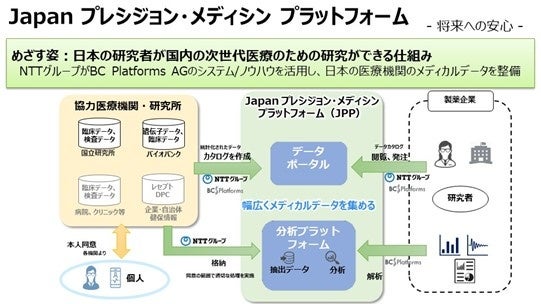 BC Platforms AG(本社:スイス、CEO:Mikaela Bruhammar、以下「BCP」)、バイオ・アクセラレーター株式会社(本社:東京都渋谷区、代表取締役:高木智史)、日本電信電話株式会社(本社:東京都千代田区、代表取締役社長:島田明、以下「NTT」)、NTTライフサイエンス株式会社(本社:東京都千代田区、代表取締役社長:是川幸士、以下「NTTライフサイエンス」)、および、新医療リアルワールドデータ研究機構株式会社(本社:京都市、代表取締役社長:是川 幸士、以下「PRiME-R」)は、医療データのセキュアな流通・活用による次世代医療研究プラットフォームの構築を推進します。また、これに伴いNTTライフサイエンスより”Japan プレシジョン・メディシン プラットフォーム※1“(以下「JPP」)の提供を本日より開始いたします。あわせて、医療・医薬品の研究開発にJPPを利用したい国内外製薬会社の募集を開始いたします。