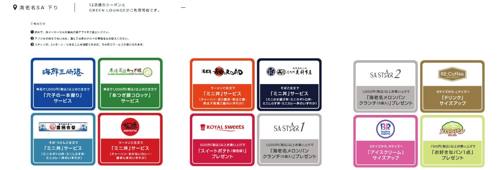 特別特典店舗 :上記5カ所のSA/PA 計21店舗にて実施。