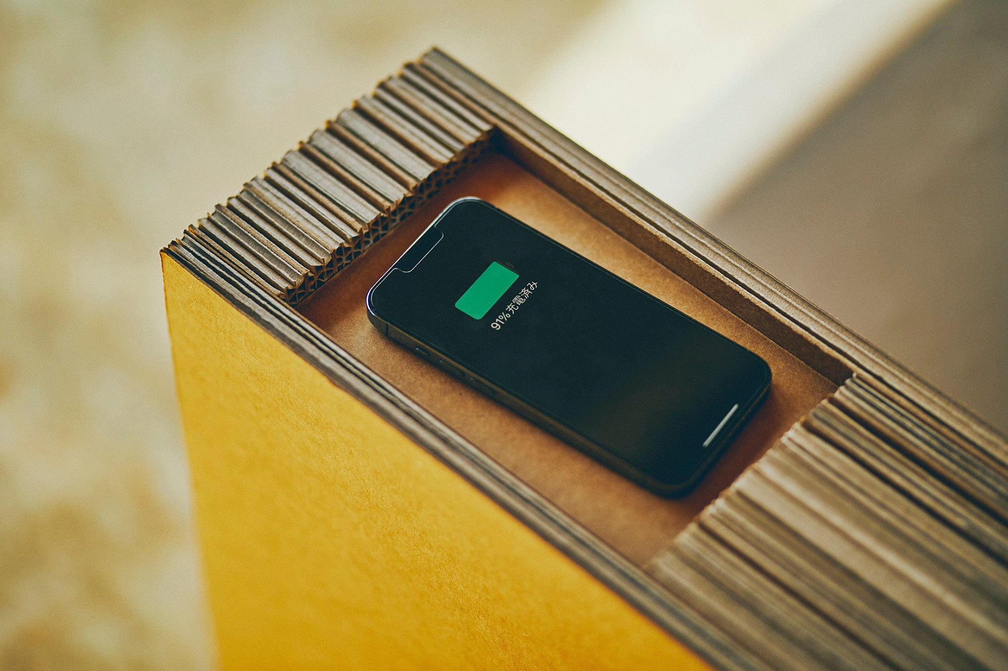 ラウンジ内の椅子「やすらぐほど充電できる椅子」では、くつろぎながらスマートフォンへの充電も可能です。もちろんこの椅子も段ボールでできており、スマートフォンへの充電は日産リーフからの給電で行います。