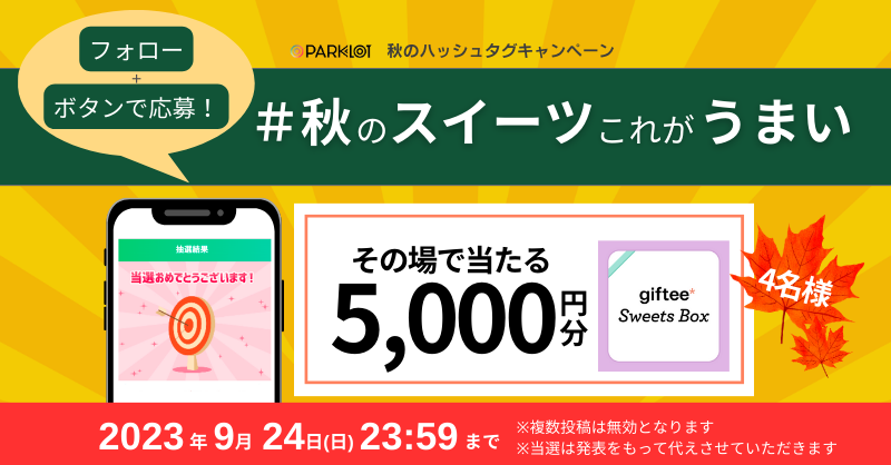 〜9月24日(日)までにPARKLoT公式X/Twitterをフォロー&指定ハッシュタグをつけておすすめスイーツを投稿すると、抽選でgiftee Sweets Box5,000円分をプレゼント〜