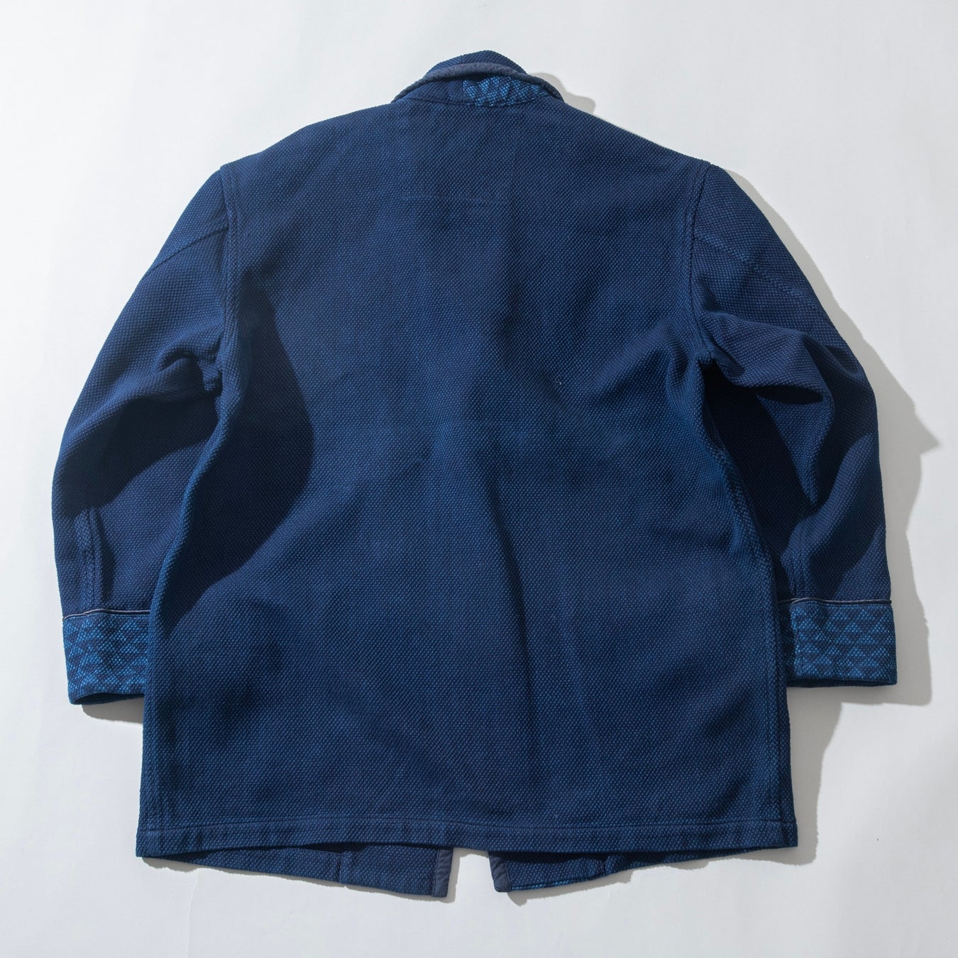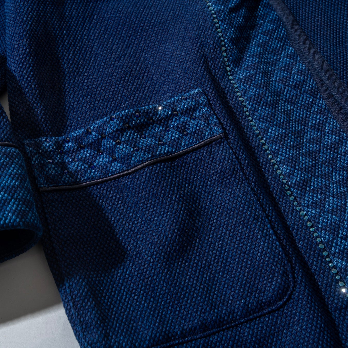 〈ブルーブルージャパン〉の代表的なサシコ生地に抜染柄を施し、伝統的な技法とモダンなアレンジを融合させたショールカラージャケットです。