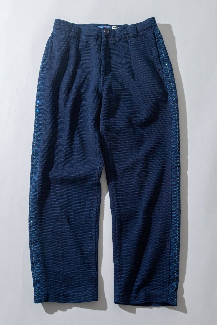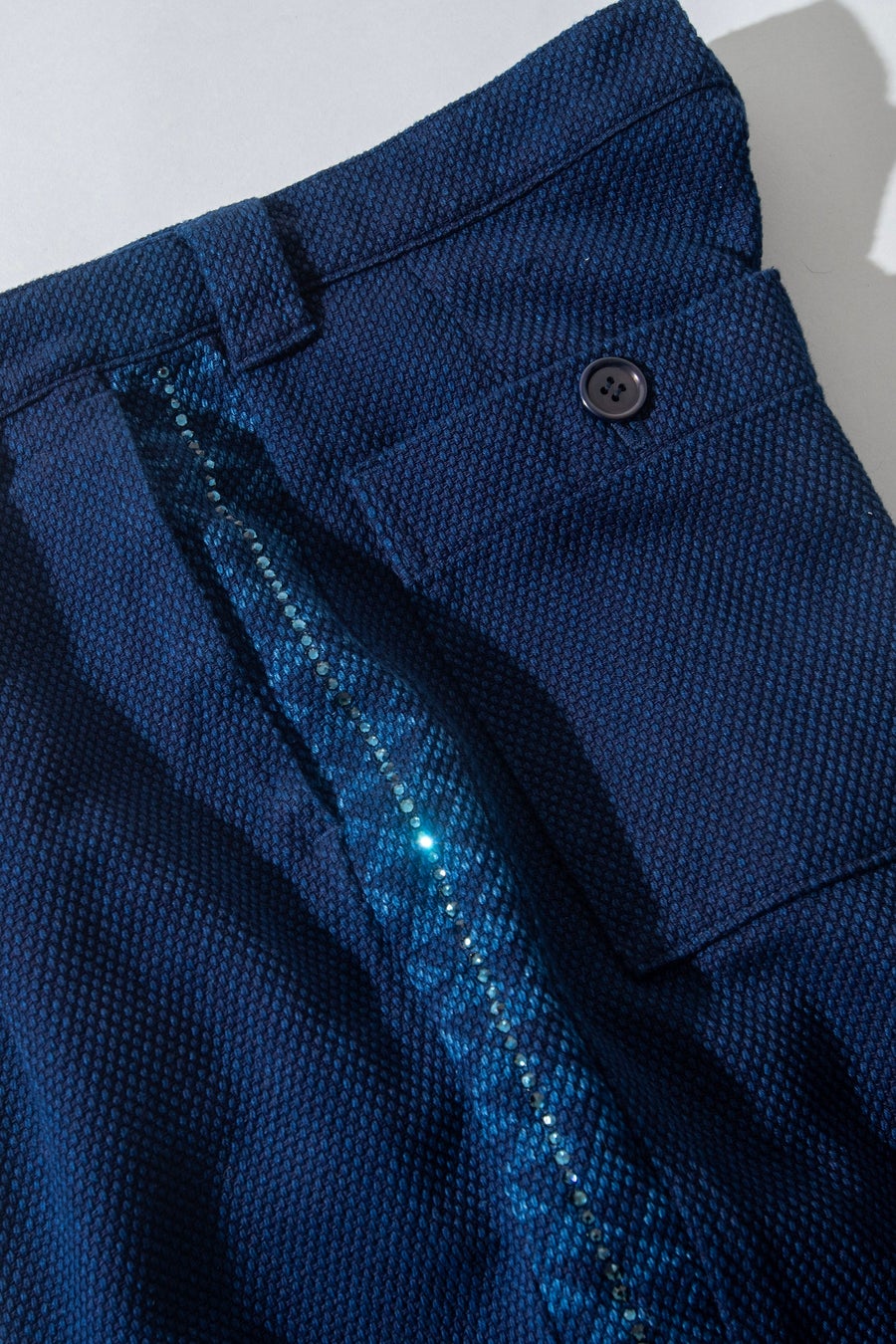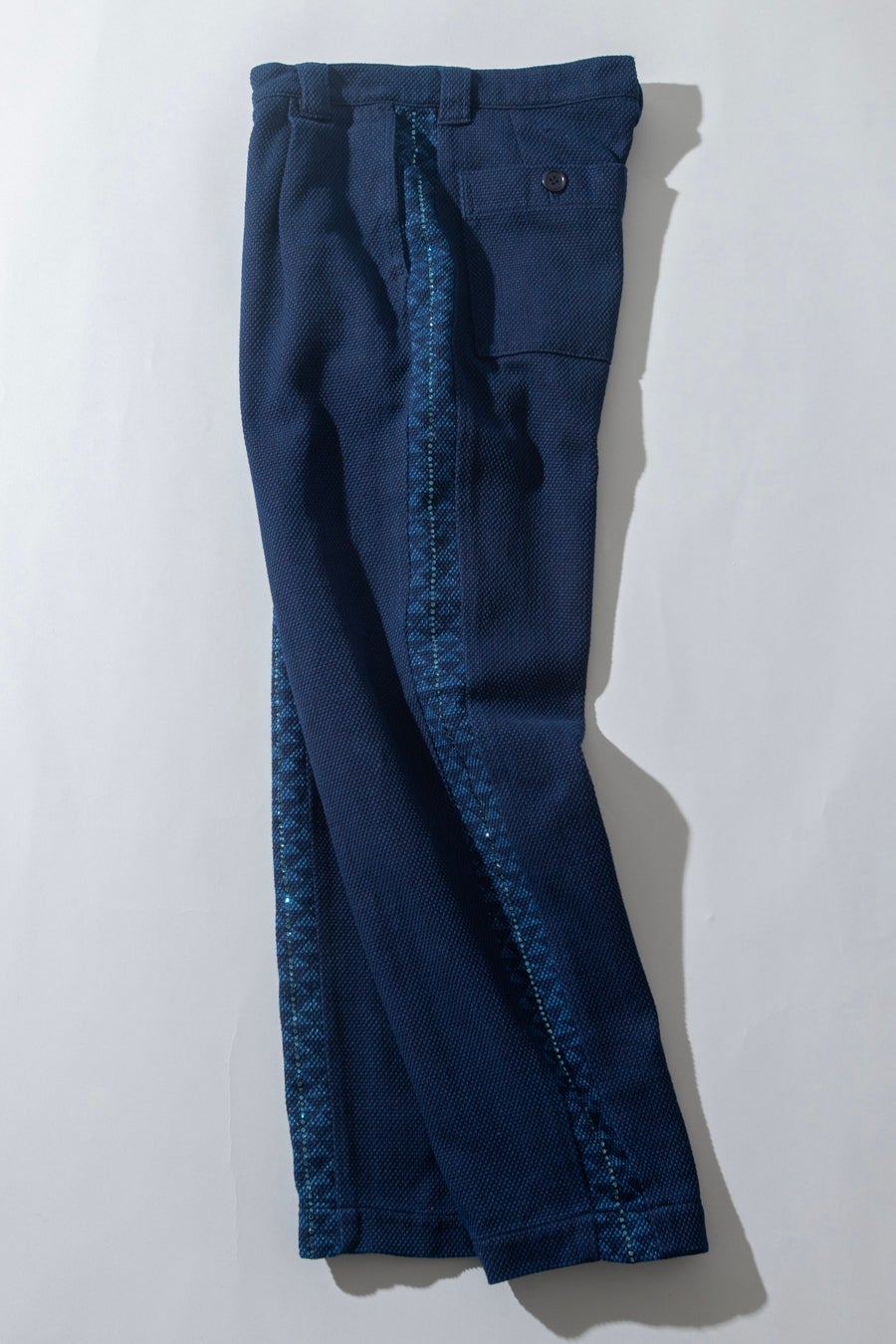 サシコ生地を使用し、サイドラインに「ウロコ柄」の抜染を施したトラウザーズです。