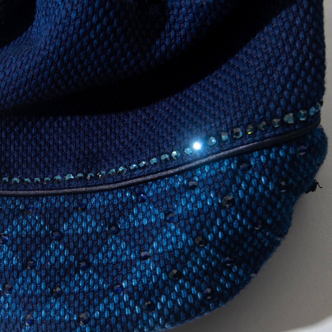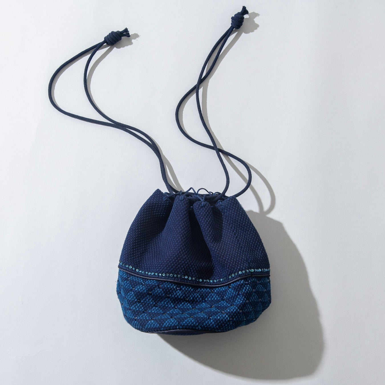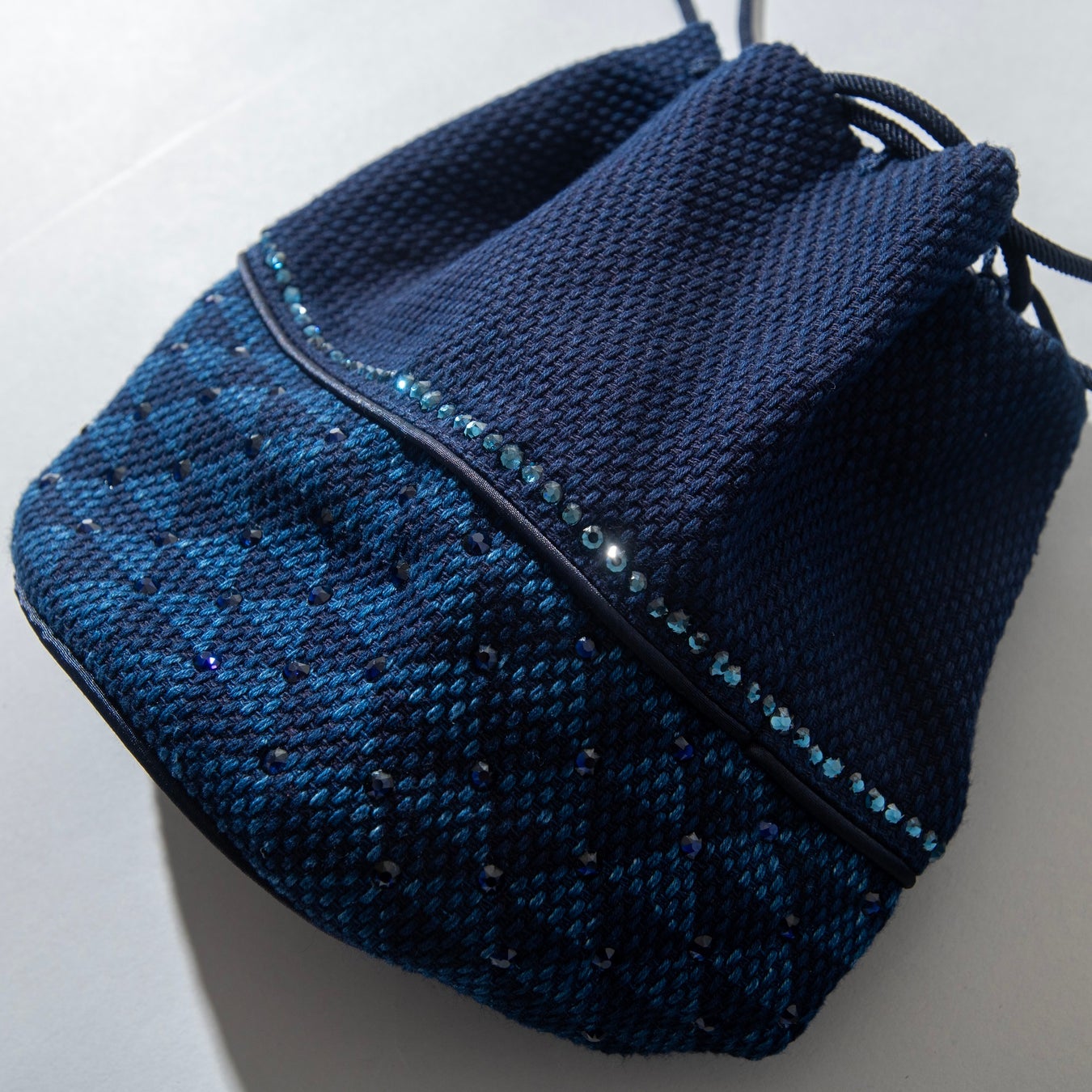 サシコ生地を使用した巾着バッグで、底部分に「ウロコ柄」の抜染を施しました。抜染柄に沿ってスワロフスキーⓇ・クリスタルを配し、伝統技法に独自の彩りを加えた特別な仕上がりです。