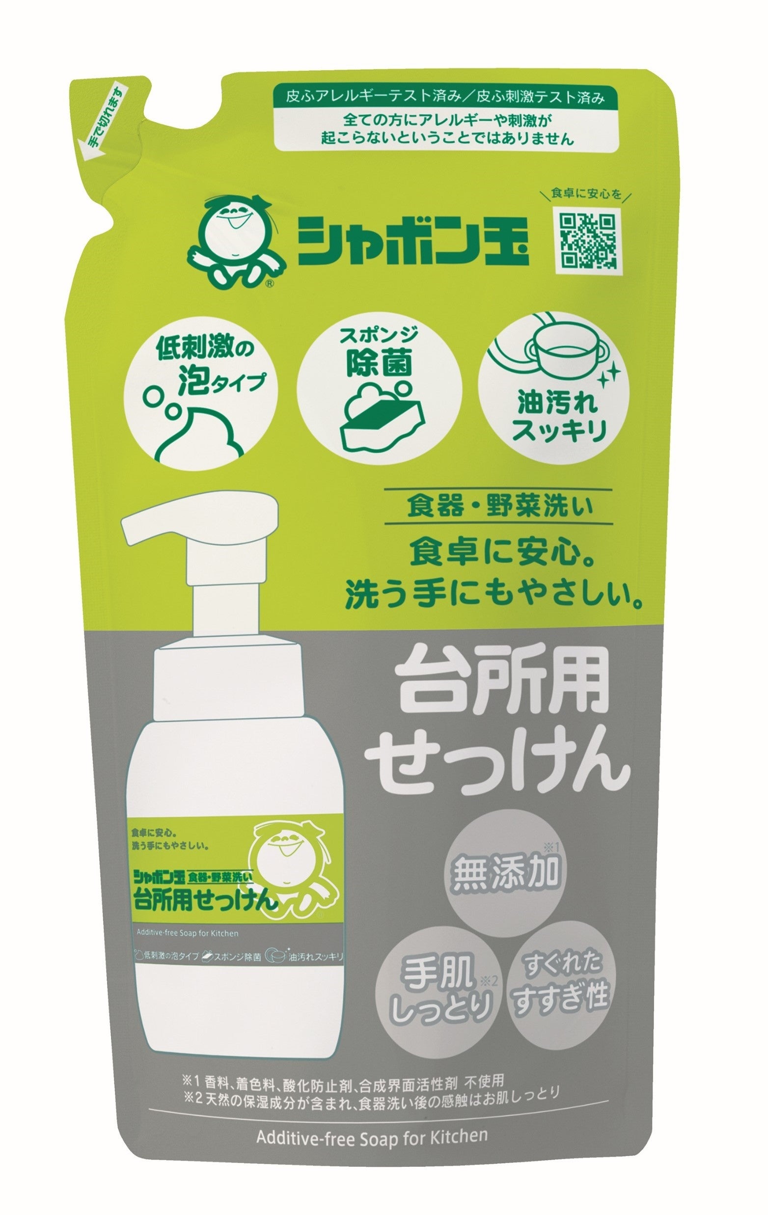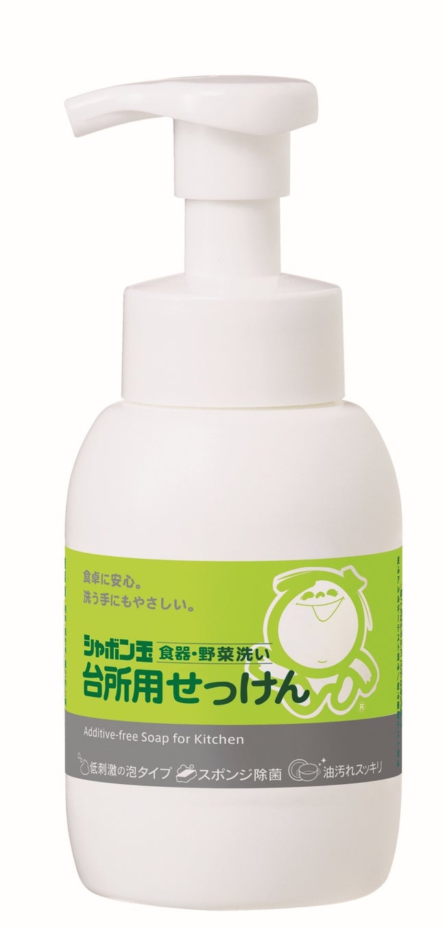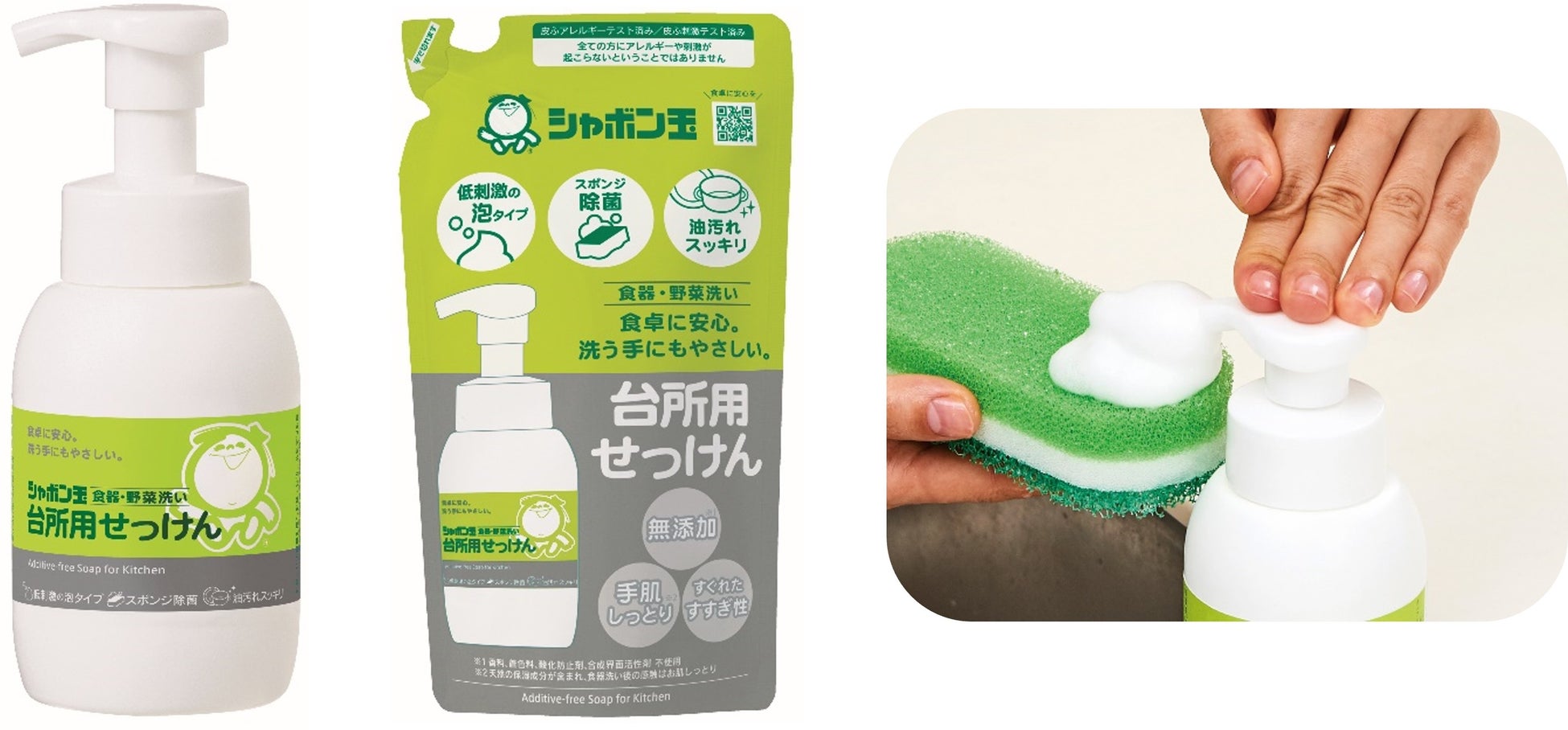 こうした背景から、泡立ての面倒さを軽減し、「ちょこっと洗い」も「しっかり洗い」もしやすくするため、「シャボン玉台所用せっけん」を「泡タイプ」としてリニューアルしました。最初から泡で出てくるため、液だれしにくく、泡立ての面倒さを解消するうえ、従来の液体タイプより泡持ちがよりよくなりました。シャボン玉石けんの台所用せっけんは、昔ながらの釜炊き製法で作っており、天然の保湿成分が含まれているため手肌にやさしく、せっけんならではのすすぎ性で手早くスッキリします。また、野菜洗いやスポンジ除菌(※3)にも使用可能です。