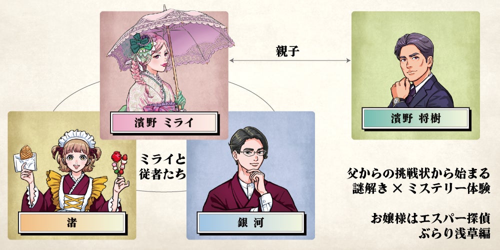 定番の観光スポットである浅草で更なるワクワク・ドキドキをお客様にお届けすべく、浅草の何処かの場所に宝箱を仕掛けました。本体験に参加する「あなた」は、エスパー能力の使い手でありながら探偵業を営むお嬢様・濱野ミライとして、さまざまなスポットを巡ることとなります。