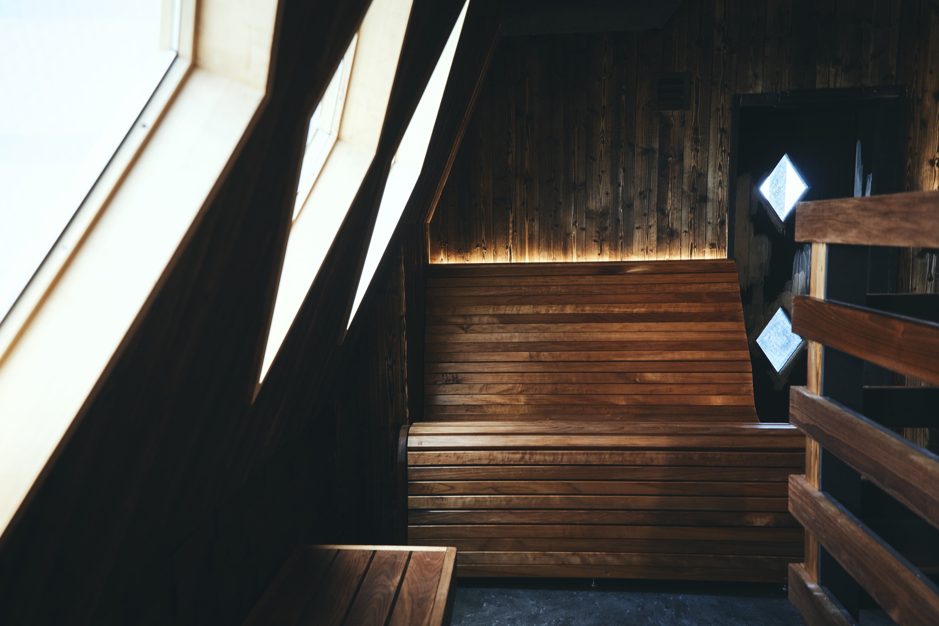 北欧産のサーモウッドが採用されたベンチは、ウィスキングの施術も可能な大型タイプに。特徴的な菱形の窓から都会の風景を楽しみつつ、サウナをご堪能いただけます。