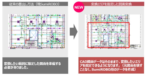 図面変換ツール上の操作で、変換したい部分を指定できるようになり、不要な図面部分を削除する作業が不要になります。
