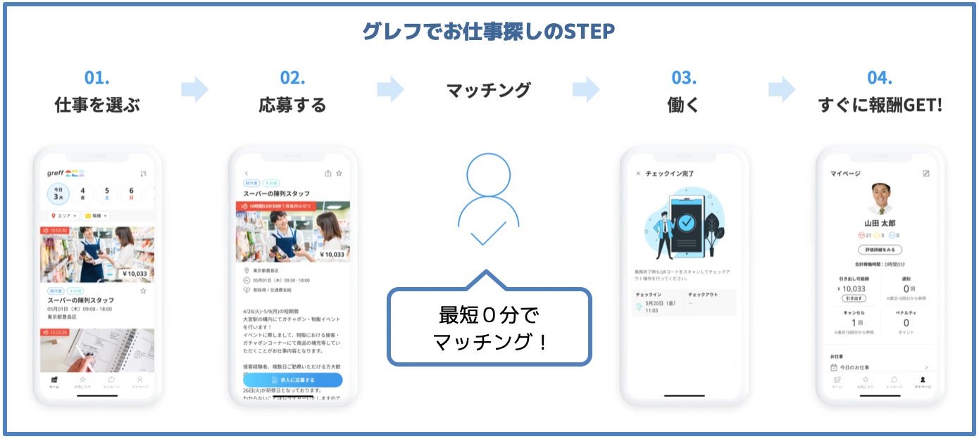 Greff(グレフ)は「人々の働きたい時間」と「企業の働いて欲しい時間」を最短0分でマッチングさせるサービスです。突然予定がなくなった休日や、ちょっとした空き時間などに1日単位から出勤が可能です。グレフは「スキマ時間」を「充実時間」にする効率的で自由な働き方を提供します。